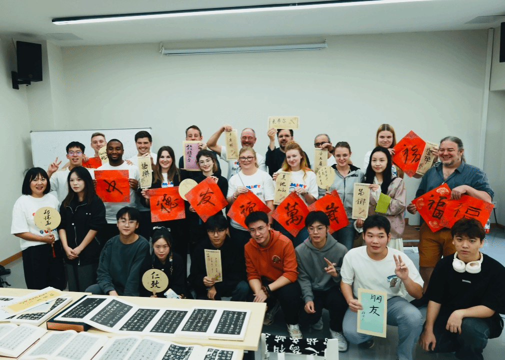 10 月 22 日,精彩继续上演。活动当天上午,汉服社的成员们身着精美的汉服,为在场的中德学子展示了汉服的典雅与华美,并详细讲解了汉服的历史文化。德国学生们在这一过程中,不仅欣赏到了汉服的外在之美,更对汉服背后的文化意涵有了深刻的理解。随后,书法社的同学们带来了精美的书法拓本,向中德学子展示了中国传统书法的魅力。他们展示了各种类型的毛笔、字帖、砚台和墨水,并详细讲解了书法的历史和技巧。德国学生们在书法社同学们的指导下,开始了练习毛笔字,并尝试用毛笔书写自己的名字,这一过程不仅锻炼了他们的书法技巧,更让他们体会到了汉字书写的独特韵味。书法社的同学们更是准备了精美的礼品,赠予德国游学团,以表达对他们的欢迎和友谊。