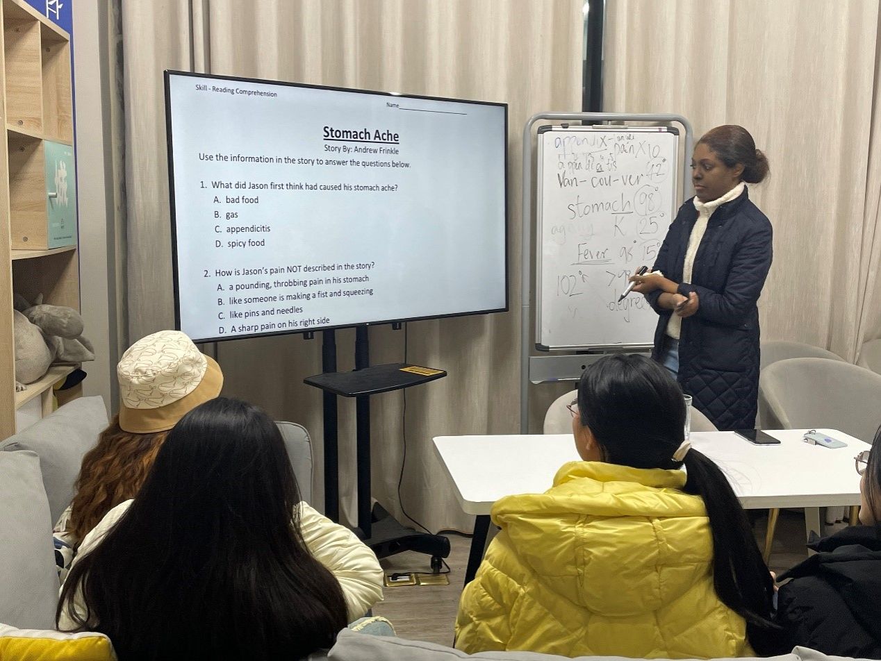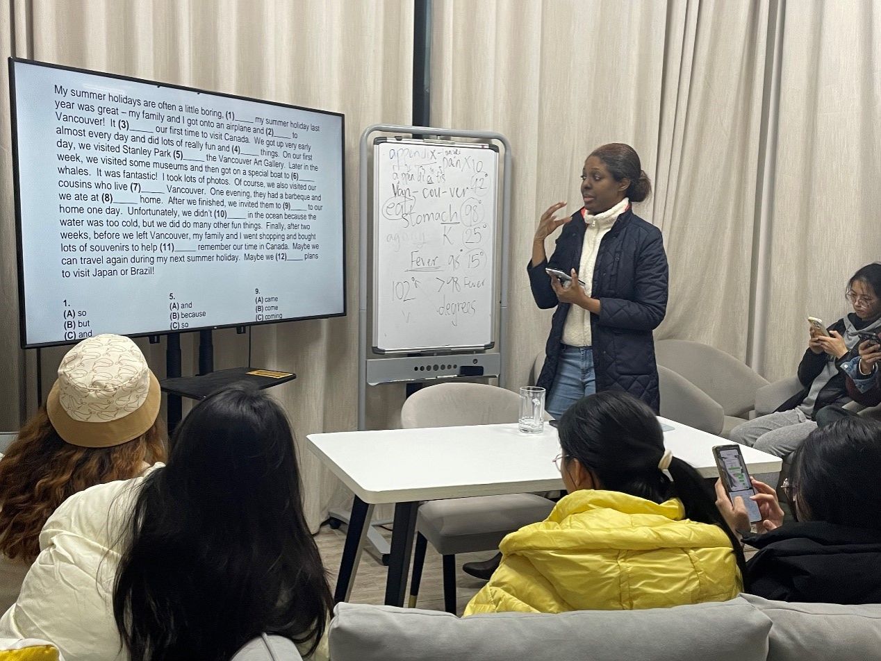 活动伊始,外教Kris,简要介绍了CET-4与CET-6的重要性以及本次英语角的目的。随后,她抛出一系列的问题:“你们认为在翻译部分有哪些难点和技巧?”“你们在备考的时候是如何扩大词汇量的?” 同学们围绕“听力提升”、“阅读理解技巧”、“写作高分策略”以及“翻译难点突破”等核心议题展开了热烈讨论。