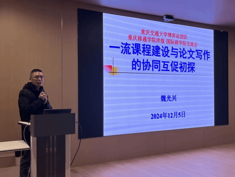 2024年12月5日,上午10时,天空书院305智慧教室,一场聚焦于“一流课程建设与论文写作协同互促”的深度探讨在此热烈展开。本次讲座由国际商学院主办,特邀重量级嘉宾——国家一流专业建设点负责人、重庆市一流课程负责人魏光兴教授,他携带着对教育与科研融合的独到见解,为现场教师们带来了题为《一流课程建设与论文写作的协同互促初探》的主题演讲,旨在深度剖析并实践两者间的互利共生策略,引领教育创新的新篇章。
