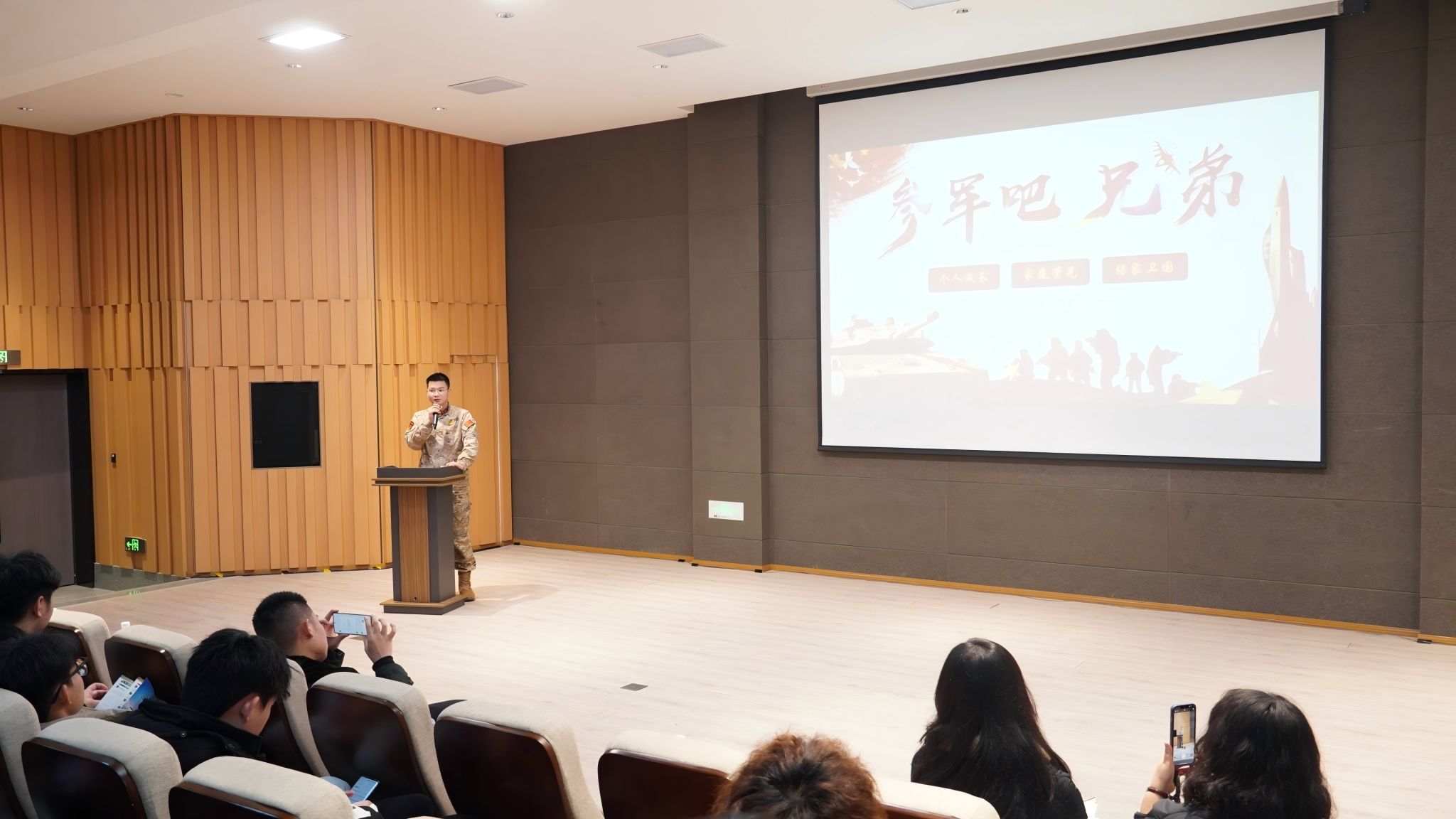 随后,合川区武装部杨参谋展开征兵政策的讲解,他以深刻的国防意识和高度的责任感,对大学生参军的意义进行了全面地阐述并解读了国家征兵政策、应征条件以及大学生参军的具体流程和优惠政策。他强调,当前国防建设迫切需要高素质兵源,鼓励大学生响应国家号召,积极投身军营,为强国强军贡献青春力量。