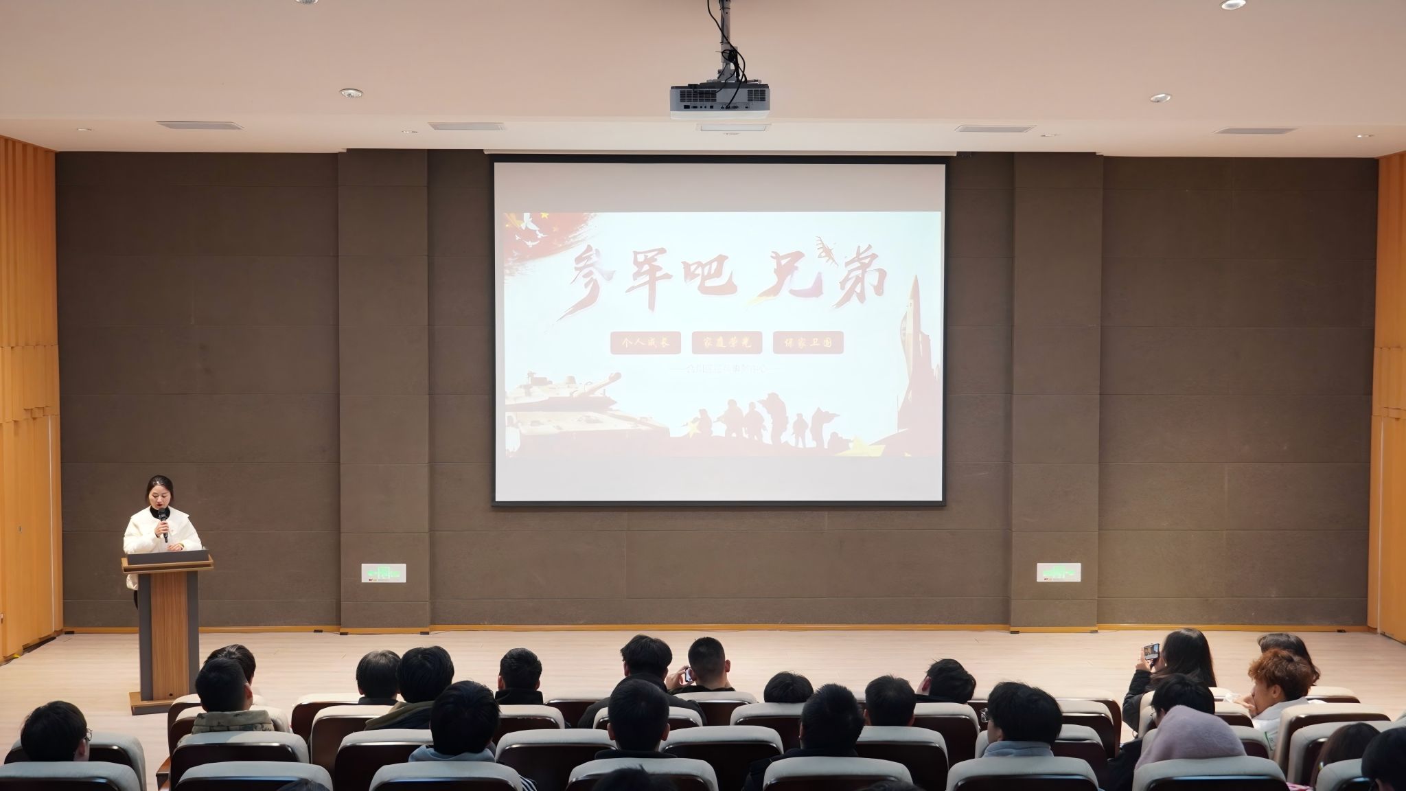 为深入贯彻习近平强军思想,进一步落实国家全民国防教育和征兵工作相关要求,增强大学生的国防意识和参军入伍的热情,加强大学生参军入伍政策宣传的针对性,扩大征兵政策宣传的影响力和辐射面。12月6日,学校邀请合川区人武部政工科李沛锦参谋、军事科杨富策参谋在六度空间无限多功能厅举行2025年春季征兵宣讲会。此次会议集聚了来自各院系的毕业班辅导员、有入伍意向的青年学生代表160余人,会议由学校武装工作部陈思主持。