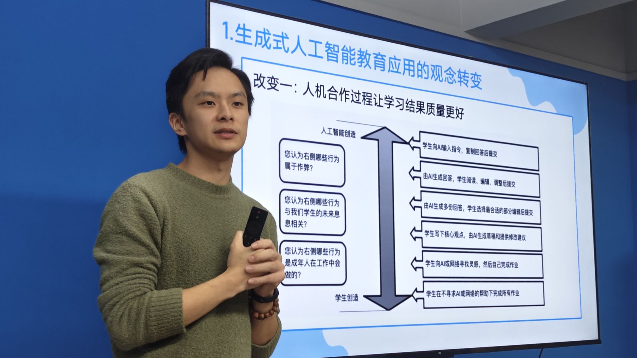 邹伽楠老师则援引北京大学教育学院汪琼教授在“高校教学因GenAI发生的改变”专题讲座中的观点,介绍了生成式人工智能的应用对教育观念的改变,分析了生成式人工智能教学应用的新模式。邹老师提出,我们面对生成式AI的冲击更应该回归教育初心,关注教育过程而不是教育产出,打破应试教育的桎梏,在全周期的教学过程管理和师生互动中探寻生成式AI赋能教育教学的可能性。