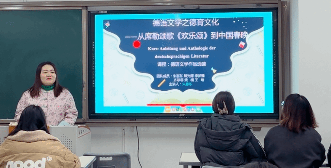朱惠东老师巧妙地从内容导入和情绪引导两方面入手,讲述德语文学之德育文化——从席勒颂歌《欢乐颂》到中国春晚,通过听、说、读、写、译五个方面,运用其深厚的知识涵养,挖掘《欢乐颂》背后的精神、中国传统节日——春节以及欢乐颂在中国的运用。