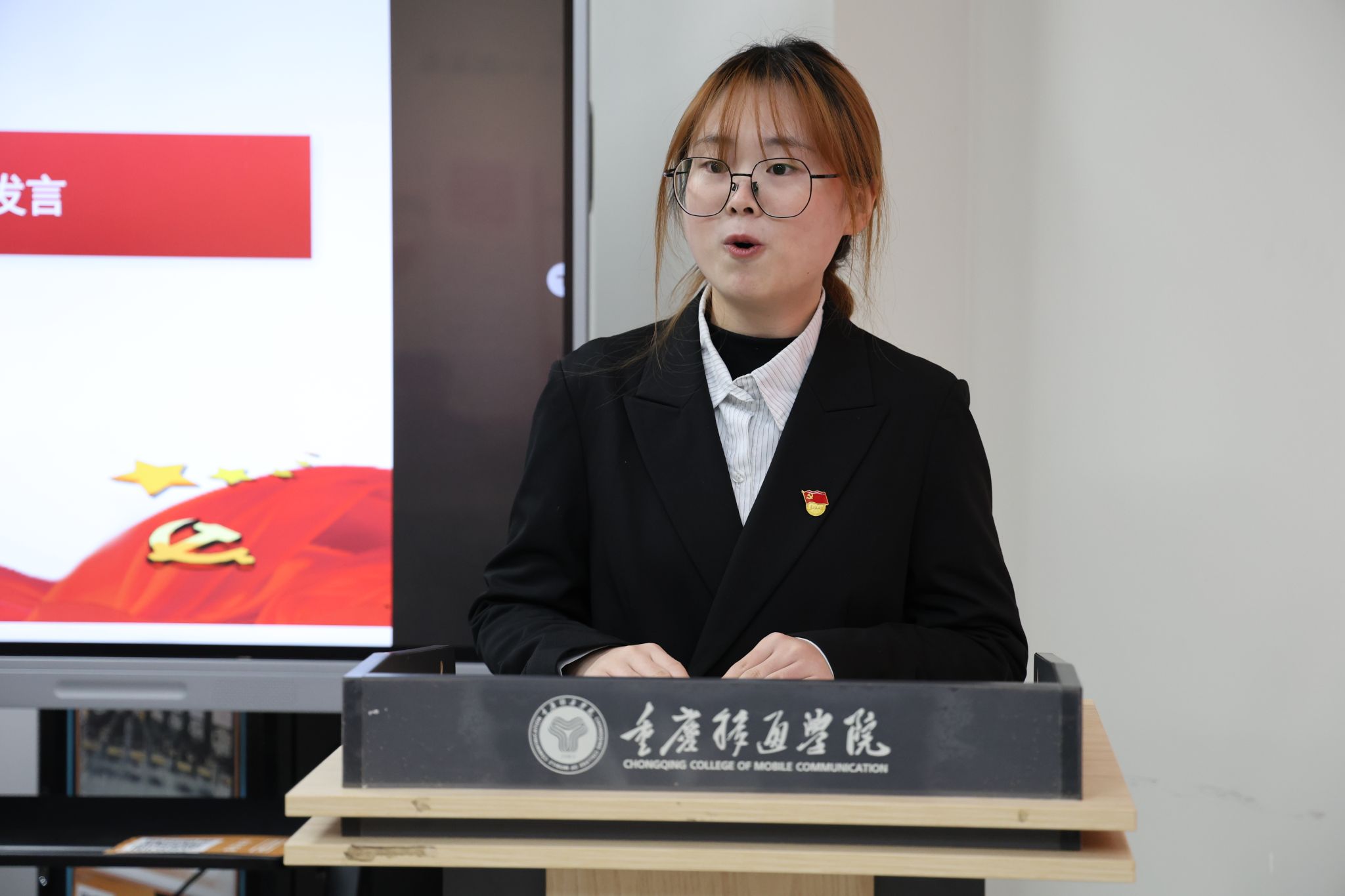 新党员代表秦峥欣同志分享了自己在党组织的教育引领和党员同志的帮助下,不断实现思想进步、转变和升华的心路历程,表达了对党组织的感激之情。并承诺将牢记党员使命,担当责任,为党和人民的事业贡献自己的力量。