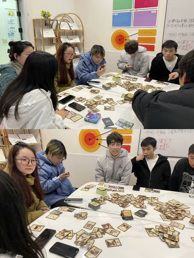 同样在12月,异科导师谭桂芳为丰富学生课余生活、缓解学习压力,在鱼城书院移通演说家功能室举办趣味桌游活动。“狼人杀”“UNO”“三国杀”等精彩桌游轮番登场。桌游融合逻辑思维、策略规划、团队协作与心理博弈等多元元素,是智慧与乐趣的盛宴。活动现场,高手玩家策略尽显、锋芒毕露,新手玩家亦凭直觉与机智创造高光时刻。学生张国川在三国杀中虽因主公决策失误与自身判断欠佳而落败,却深刻领悟策略抉择之重要;蓝云天则于狼人杀中掌握角色策略与手牌运用,提升决策能力。在这数字化时代,桌游成为社交强纽带,让学生暂别电子设备,于面对面互动中感受真实人际交往的温暖,师生借此加深了解,情谊悄然滋长。