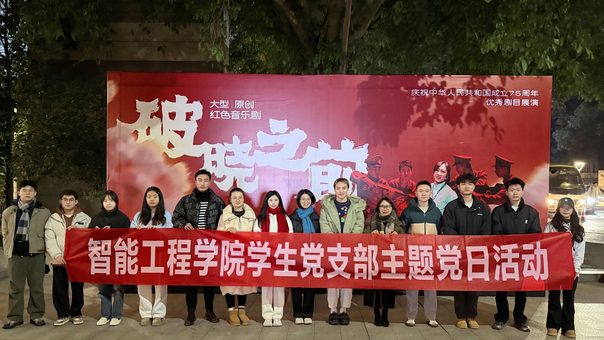 12月13日19时,智能工程学院学生党支部16位师生党员前往缤果大剧院,观看我校大型原创音乐剧——《破晓之前》。