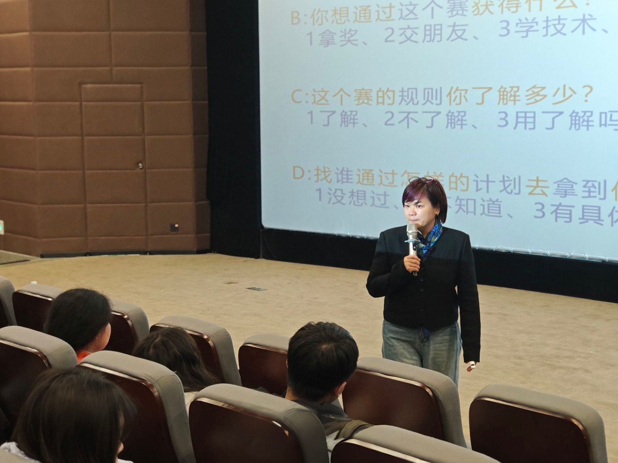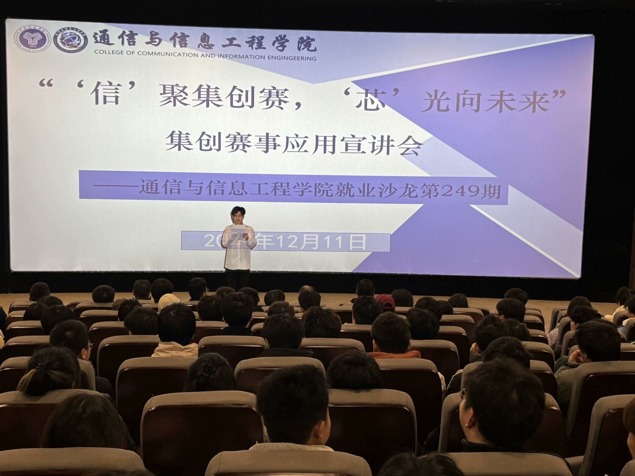 活动开始,就业助理团的廖洁龙同学介绍活动的背景及宣讲活动的嘉宾。随后,信诺达泰思特科技股份有限公司邓亚芬总经理围绕聊赛事、学技术、看实例、练操作、聊行业、找工作五个方面展开讲解。她以求职中的自我介绍为切入点,深入分享了集成电路行业成功的秘诀,强调专业技能与实践经验的重要性。详细解读了什么是全国大学生集成电路创新创业大赛,集创赛设有8个大赛道和21个杯赛,每个赛道下的不同杯赛均承载着独特的特色与需求。在随后的交流环节,邓总经理与学生围绕如何组队、备赛、参赛展开激烈的交流。