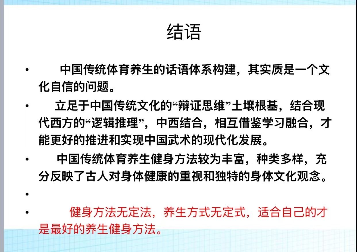 李艳丽老师观后感:对于我们体育老师来说,作为教育工作者自身先要做好健身养生方面的知识储备,也需要给学生传递一些关于传统体育养生方面的机理和常识,让他们有这方面的意识。在工作之余,平时也注重对身体的保养,也在健身养生;陈教授这次讲座也让我受益匪浅,从传统武术养生机理的解读,以及十二时辰养生法,都让我对身体有了更好的了解以及重视。
