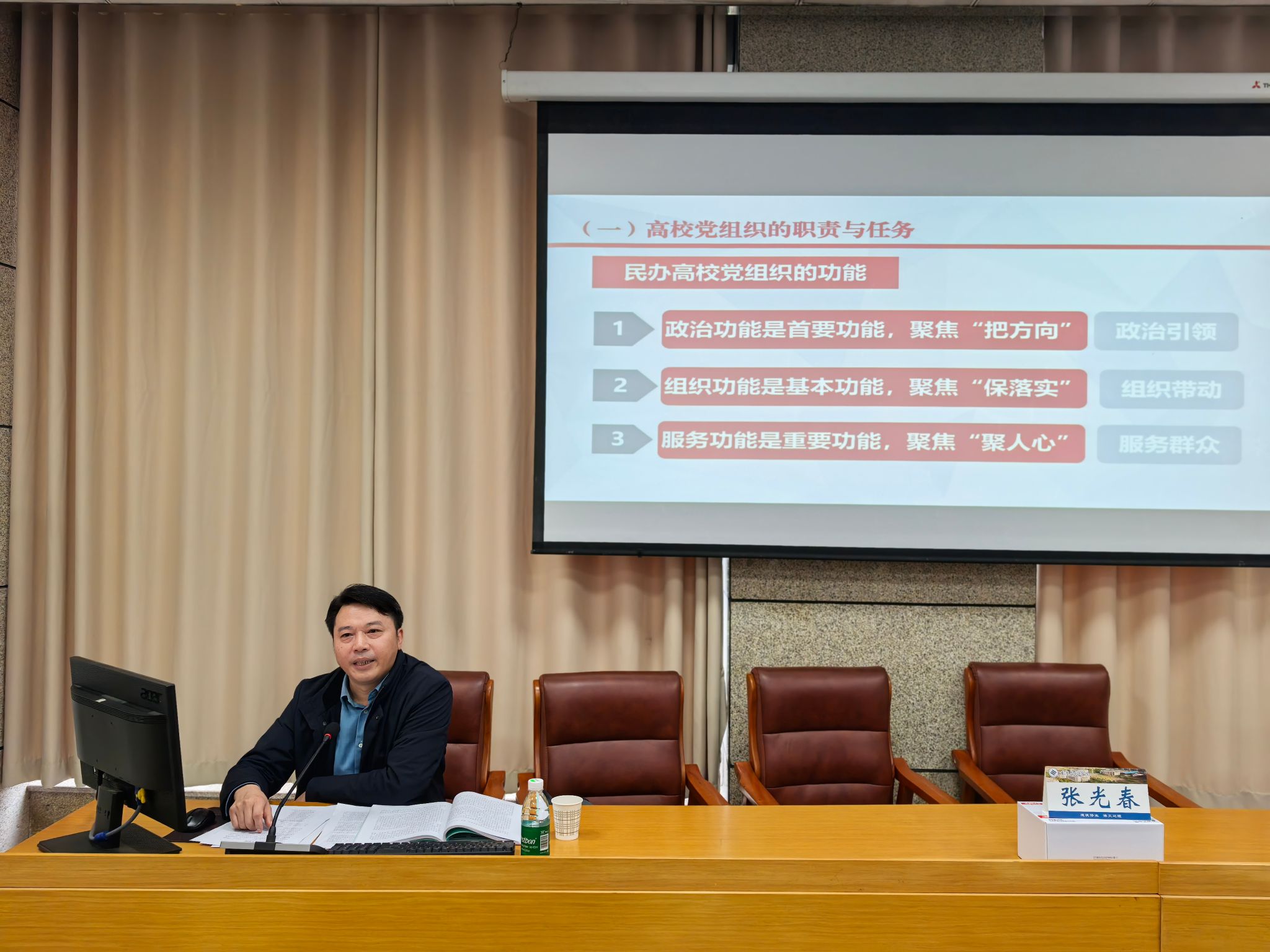 培训期间,多位专家学者为学员们带来了精彩的专题讲座。重庆文理学院教务处处长胡守敏教授深入解读了党的二十届三中全会精神,帮助学员们深刻理解全会召开的背景、重大举措及贯彻落实的具体路径,使其明确如何将全会精神与实际工作相结合,为建设现代化新重庆贡献力量。重庆轻工职业学院党委书记张光春副教授凭借丰富的党建经验,详细阐述了新时代民办高校党务干部履职能力的构建与提升方法,引导学员找准工作方向,提升党务工作实效。重庆人文科技学院教授张国镛围绕习近平总书记关于做好组织工作的重要论述,通过深厚的理论知识、详实的案例,深入剖析其历史、理论和实践逻辑,助力学员深化认识,提高组织工作水平。重庆科创职业学院党委书记董刚教授对“六大纪律”进行了深入解读,结合典型案例,强调了纪律的严肃性,增强学员的规矩意识。西南政法大学邓斌教授则系统讲解了党内法规制度体系,为学员提供了清晰的工作指引,提升其业务能力与责任意识。重庆市教委组织干部处调研员周正发全面阐释了《中国共产党普通高等学校基层组织工作条例》,明确了高校党建工作的基本遵循。重庆文理学院党委常委宣传部长蒋礼文以网络热点事件为切入点,深入分析高校网络舆情的特点与应对策略,拓宽了学员的工作视野。