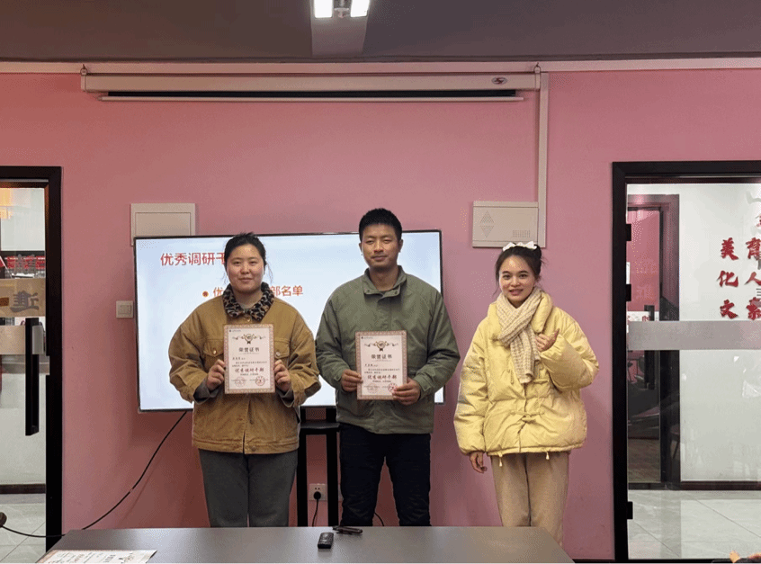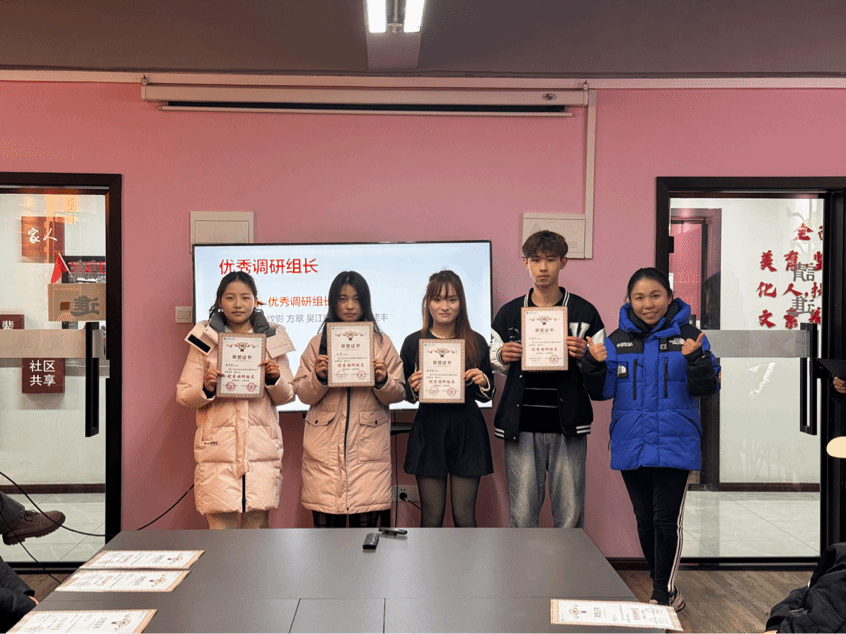 在发言环节中,多位优秀调研员和干部分享了他们的亲身经历和收获。“这次调研不仅让我学到了很多专业知识,更加让我明白了如何面对挑战,如何与他人合作共同完成任务。”优秀调研员陈梨铭同学谈到,调研过程中,她通过与不同背景的人交流,提升了自信心和表达能力,这对她参加求职面试起到了重要作用。黄金华同学也分享了自己在调研过程中的成长。他表示,调研本身就是一个勇敢突破自我的过程,在调研过程中,每一次面对陌生人、每一次克服沟通障碍,都让他感受到自我提升的力量。他建议,所有参与调研的同学将调研看作是一场“探索游戏”,通过发挥自己的创造力和主动性来完成每一个任务,并在过程中不断锤炼自己的团队合作精神和沟通能力。此外,优秀调研干部罗显城同学分享到,调研初期最大的挑战是面对被拒绝时的挫败感。但通过队友的支持,他勇敢迈出第一步,这段经历帮助他从内向蜕变为能够自然表达的自己。
