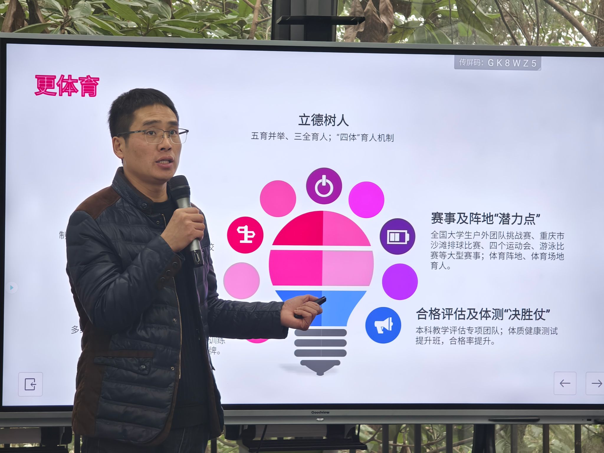 最后,重庆移通学院党委副书记、常务副校长周伟讲话。他对竞技体育中心2024年体育工作从团队建设、赛事成绩、全校体育工作开展予以充分肯定,并就做好下一步工作提出要求。一是要规范建立健全部门考核制度、校队管理制度、场地管理制度等相关制度,更好的服务于部门发展。二是要制定清晰的工作目标,全国应急救护示范学校、重庆市特色体育学校、重庆市沙滩排球训练基地体现工作授牌等,体现工作成效。三是要发挥体育育人作用,整合全校体育资源,联动学院、书院,形成合力,共同推动好全校体育工作;四是注重育人成果凝练,讲好体育故事,传递好体育精神;五是贯彻学校“最体育非体育大学”建设,从赛事活动体系搭建、校队外出参赛荣誉,一定从自身做起。六是本科教学评估、体质健康测试、全校体育场地规划使用,以评促建,推进体育各项工作,共同开创体育特色高质量发展的新局面。