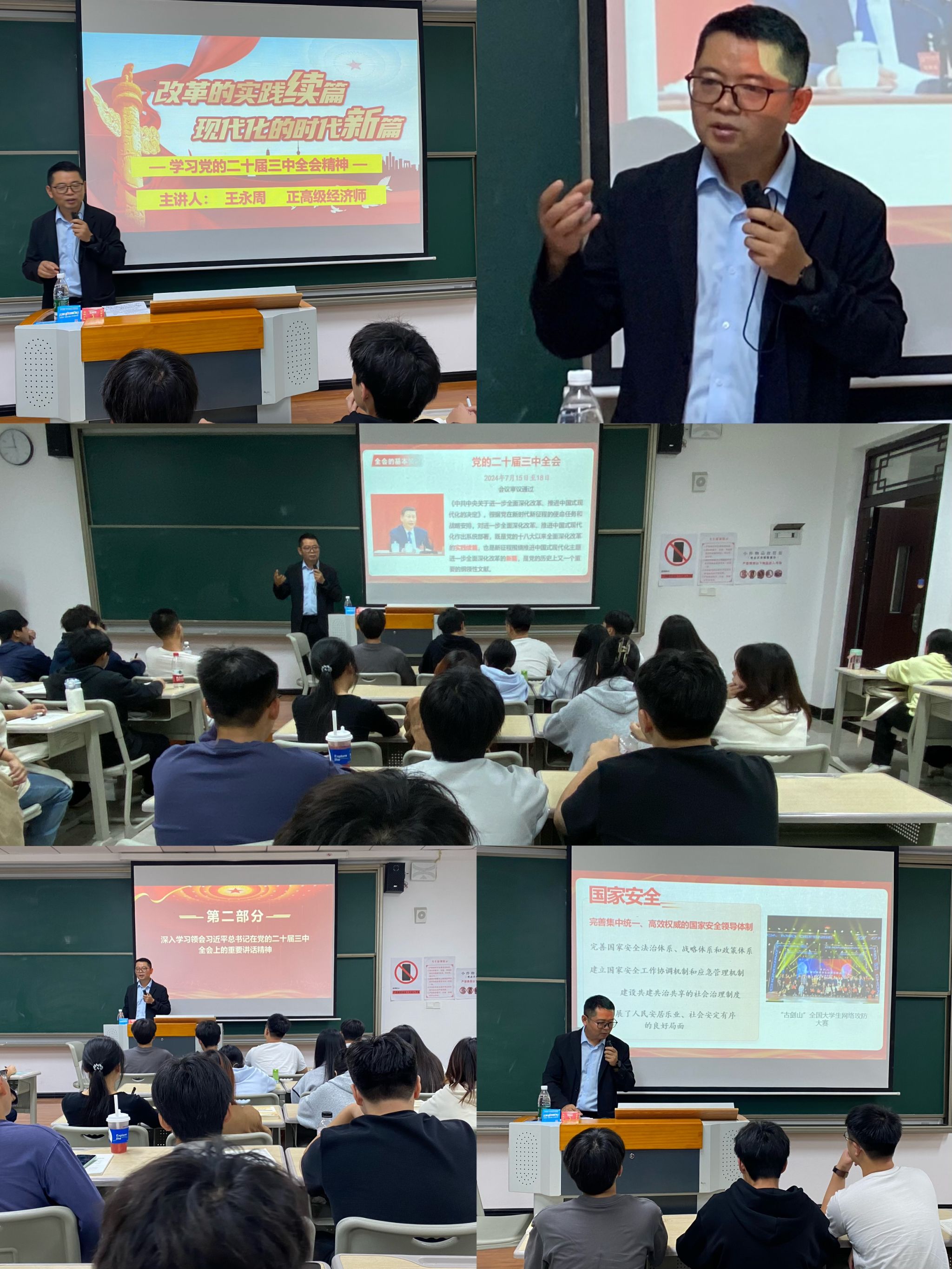 10月17日,党委副书记、常务副校长、綦江校区党委书记王永周走进课堂,为我校2023级体育经济与管理班的同学精心讲授了一堂由浅入深,内涵深刻的思政课。王永周副书记指出,党的二十届三中全会是在新的历史起点上进一步全面深化改革、推进中国式现代化的总动员、总部署。全会提出的一系列改革措施,对党的二十大提出的目标进行了具体化和深化,为我国实现高质量发展明确了方向和举措。王永周副书记还结合国内外时事热点,用生动的案例和丰富的数据,向同学们展示了国家在政治、经济、文化等方面取得的巨大成就,以及面临的诸多挑战。他鼓励同学们要坚定理想信念,勇于担当,为实现中华民族伟大复兴的中国梦贡献自己的力量。同学们纷纷表示将认真学习党的二十届三中全会精神,勇担时代使命,刻苦钻研专业,在教育强国建设中绽放青春光彩。