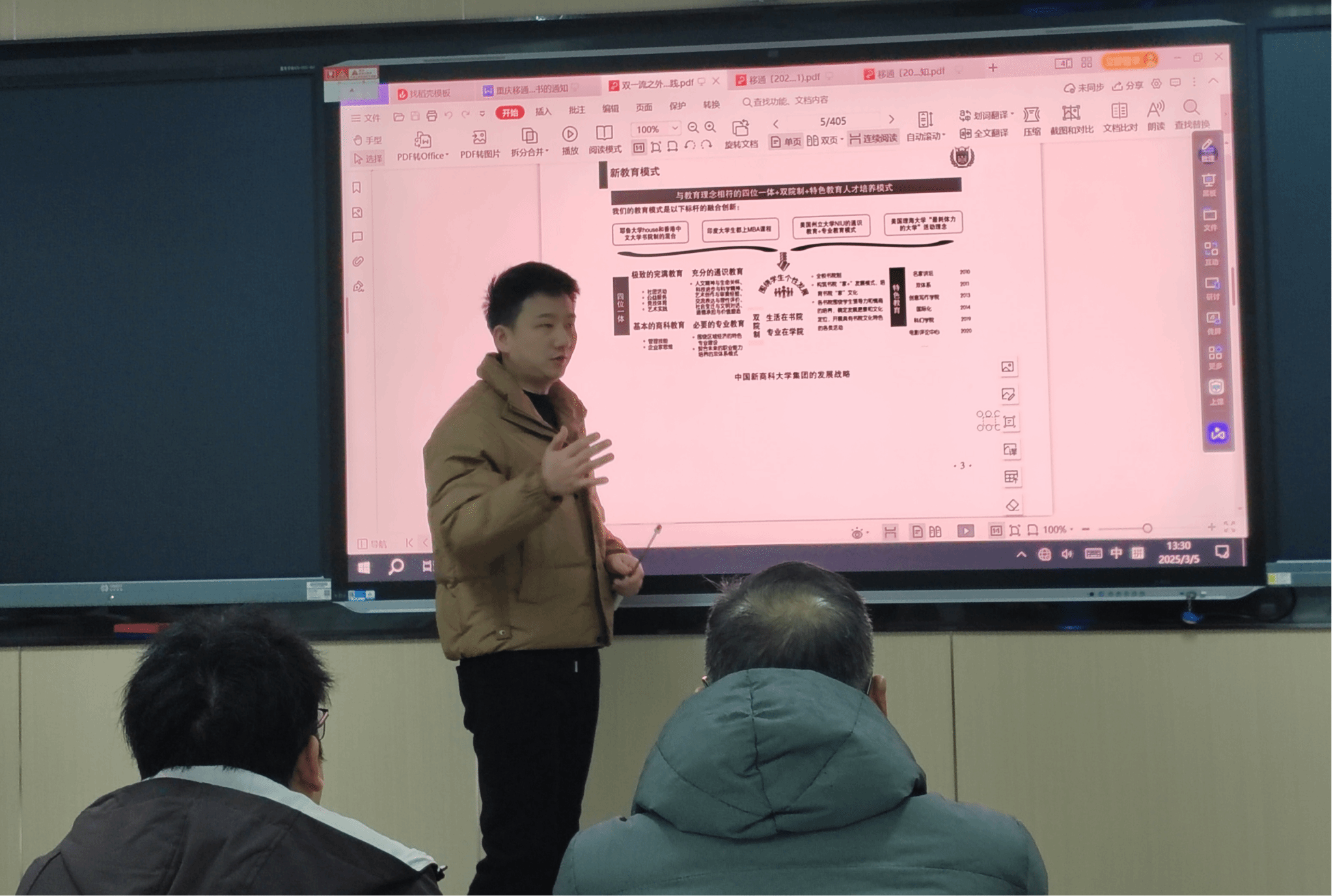 3月5日,智能制造教研室全体教师在教研室主任寇晓培的带领下,于9114智慧教室认真学习董事长讲话及《双一流之外的首选大学》一书,其中“培养阳光、快乐、友爱的学生”这一理念深深触动了大家。它需要学校从教育模式、课程设置等方面全面进行,为学生提供多元化的发展平台;需要教师不断提升自身素养,关注学生的个体差异,因材施教;也需要学生自身积极探索,勇敢追求梦想,树立正确的成功观。在未来的教育实践中,教研室全体教师将以这一理念为指引,不断努力,为学生的成长和发展贡献自己的力量,让每一位学生都能在阳光、快乐、友爱的氛围中茁壮成长,成为对社会有用且能实现自我价值的人。