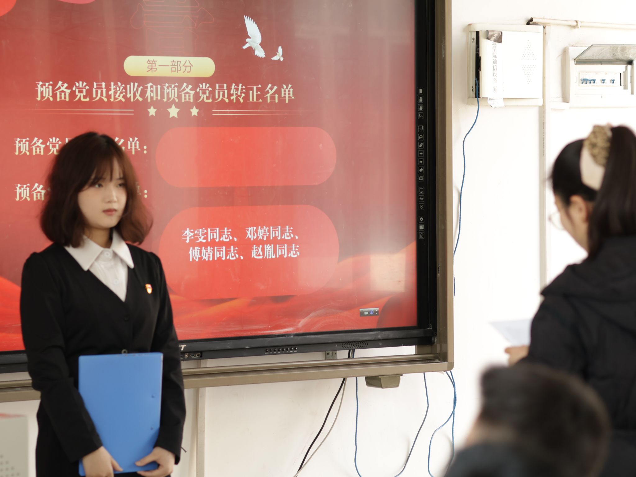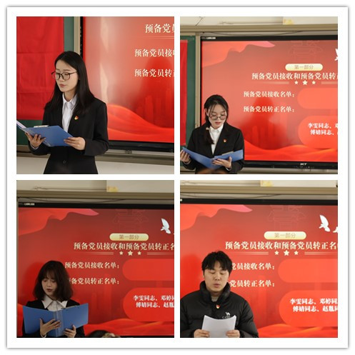 按照党员转正程序,李雯、邓婷、傅婧、赵胤共4名预备党员同志,依次向党组织汇报了个人在预备期内的思想、学习与实践等情况,明确了入党动机并表达了自己对加入中国共产党的坚定决心。入党介绍人介绍转正同志的主要情况以及参会党员发表意见,对其能否转正表明自己的意见。