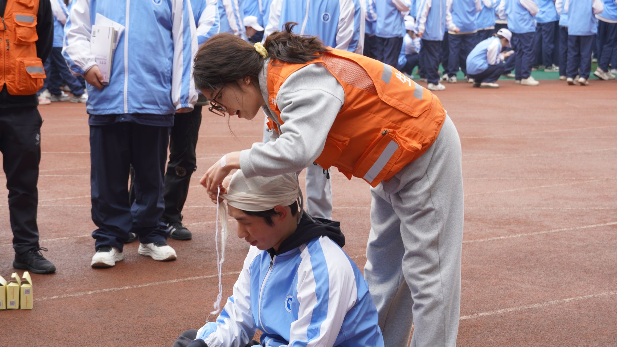 针对不同伤口的处理,教官还展示了环形、螺旋、“8”字等多种包扎技巧。学生们两人一组,互相练习绷带与三角巾的使用,现场气氛热烈有序。“包扎不仅是技术,更是对伤者的心理安抚。”培训师强调,冷静应对意外伤害是急救的关键原则之一。