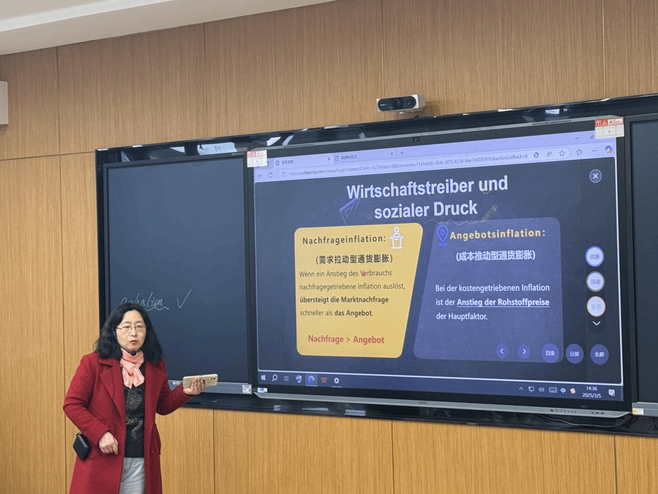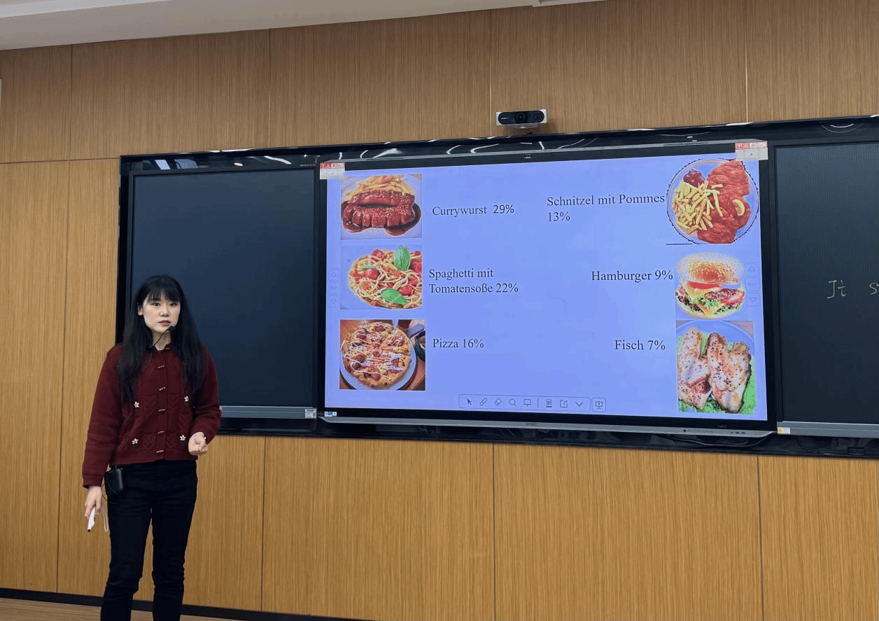 荣婧老师以“Essen und Trinken(饮食文化)”为主题,讲授语法点德语比较级(gern, lieber, am liebsten)。授课过程中,荣老师通过中国“荤素搭配”“不时不食,应季而食” 传统饮食理念,增进学生对中国饮食文化的了解。在课程总结环节,她帮助学生梳理重点知识,并布置了与日常生活紧密相关的课后练习,巩固学习效果。同时鼓励学生对不同饮食文化、个人饮食喜好等问题发表看法,培养学生独立思考、批判性思维和清晰表达观点的能力。