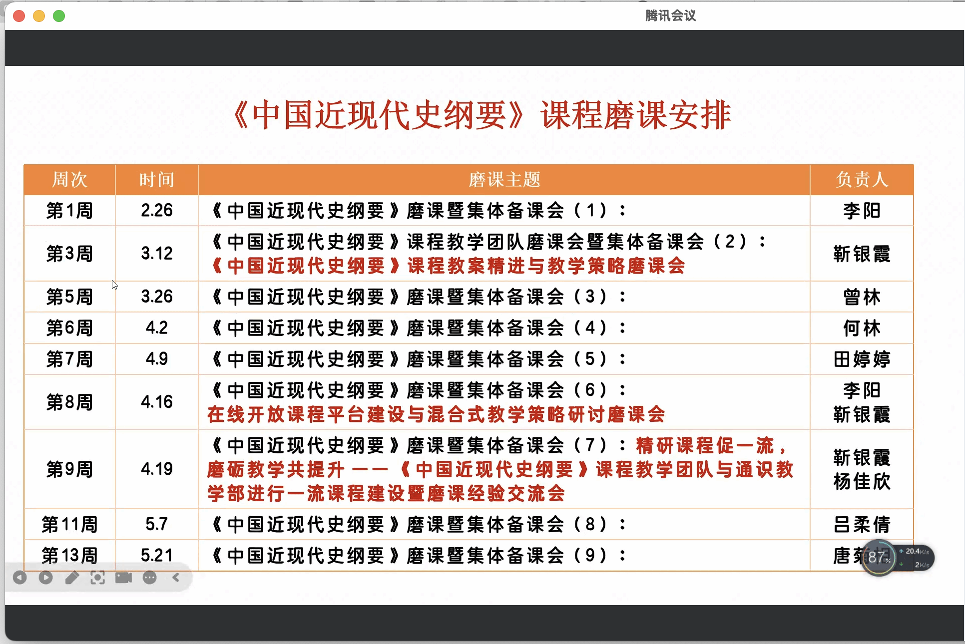 为明确新学期发展方向,凝聚团队奋进力量,《中国近现代史纲要》课程教学团队于3月5日晚上七点召开了2024 -2025学年第二学期工作部署会议。此次会议以线上形式举行,由团队带头人靳银霞老师主持,全体成员齐聚云端,共同围绕新学期重点工作任务展开深入研讨,共同擘画团队新学期发展蓝图。