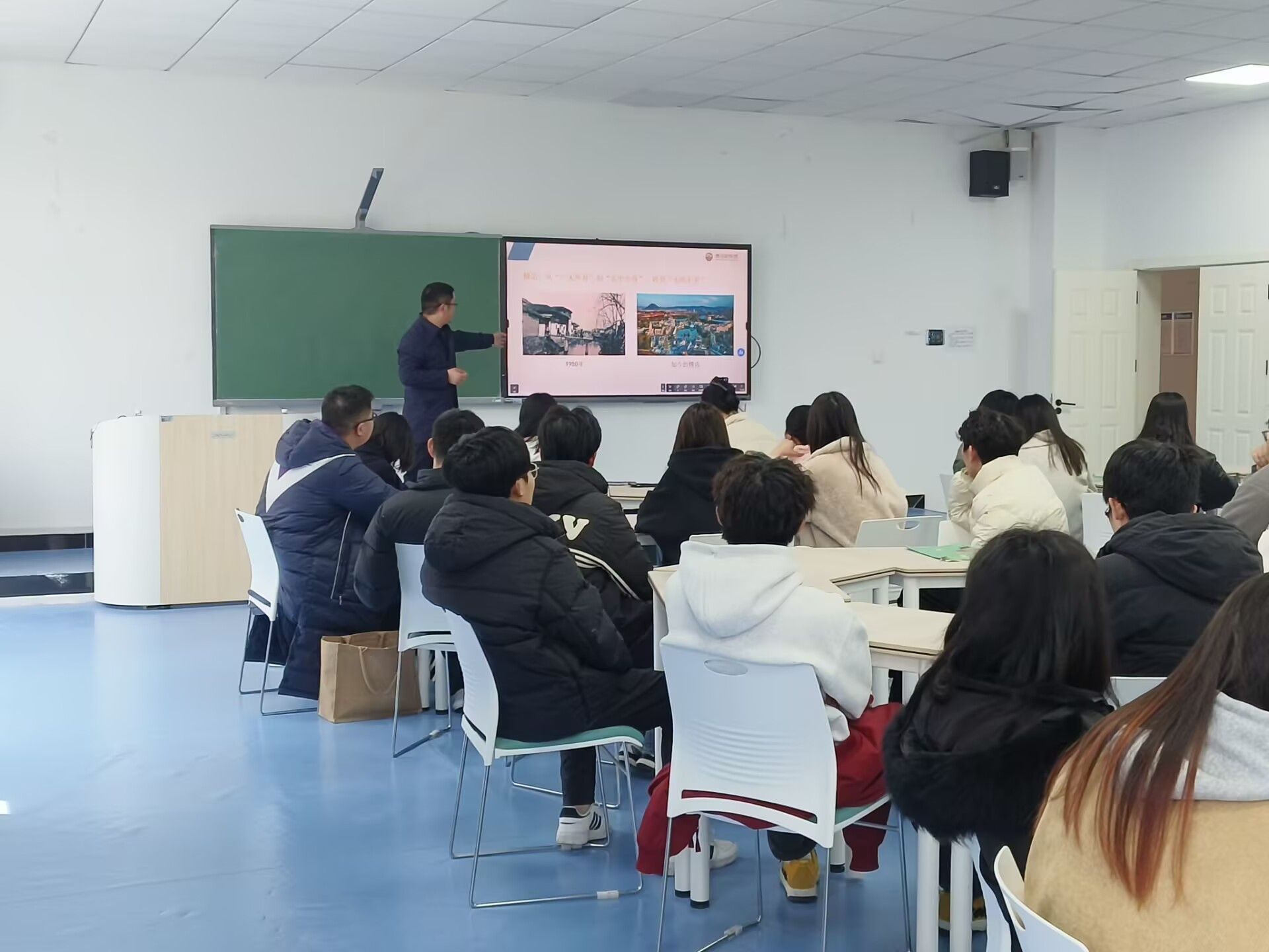 李建杰老师以幽默风趣的语言拉开了横店影视城发展历程的序幕。他从横店影视城的创立背景讲起,分享了横店如何从一个普通小镇逐步发展成为全球规模最大的影视拍摄基地之一。李老师特别提到,横店影视城始终紧跟当下潮流,不断创新经营模式,从单纯的影视拍摄场地出租,拓展到集影视拍摄、旅游观光、文化体验、休闲度假为一体的综合性产业集群,这一转变赢得了现场同学们的阵阵掌声,大家积极响应,互动频繁。