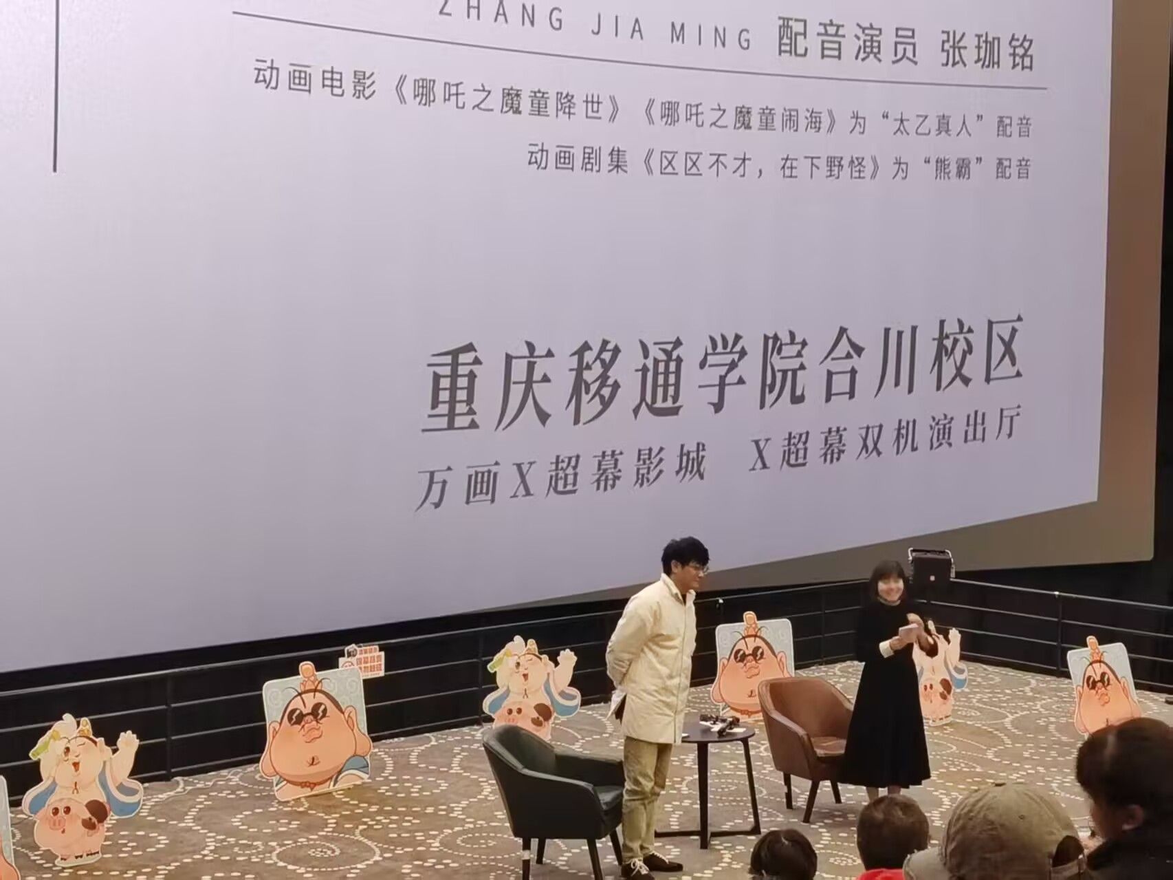 3月15日,万画影城化身动画艺术的交流殿堂,《哪吒之魔童闹海2》中太乙真人的配音演员张珈铭老师惊喜现身,与怀揣热爱的同学们开启了一场别开生面的路演活动,在光影与声音交织的世界里,碰撞出奇妙火花。此次活动由经验丰富的晏莉老师担任主持人,为现场增添不少亮色。