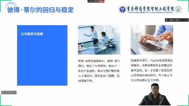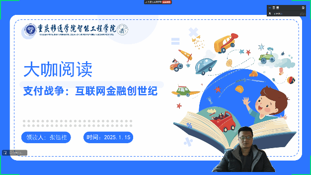 2月6日,智能制造教研室张钰柱老师,周平老师,杨斯琦老师分别带领自己所带学业导师班级开展了一场别开生面的线上大咖阅读活动,阅读书籍为《支付战争:互联网金融创世纪》。这本书讲述了在线支付巨头PayPal的创业历程,让同学们深入了解互联网金融领域的风云变幻。