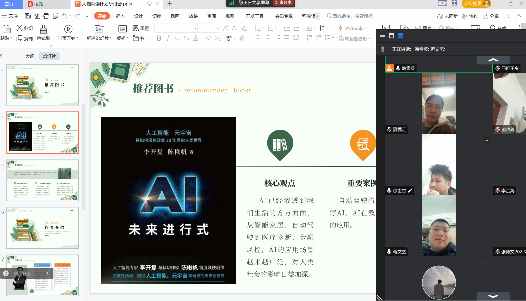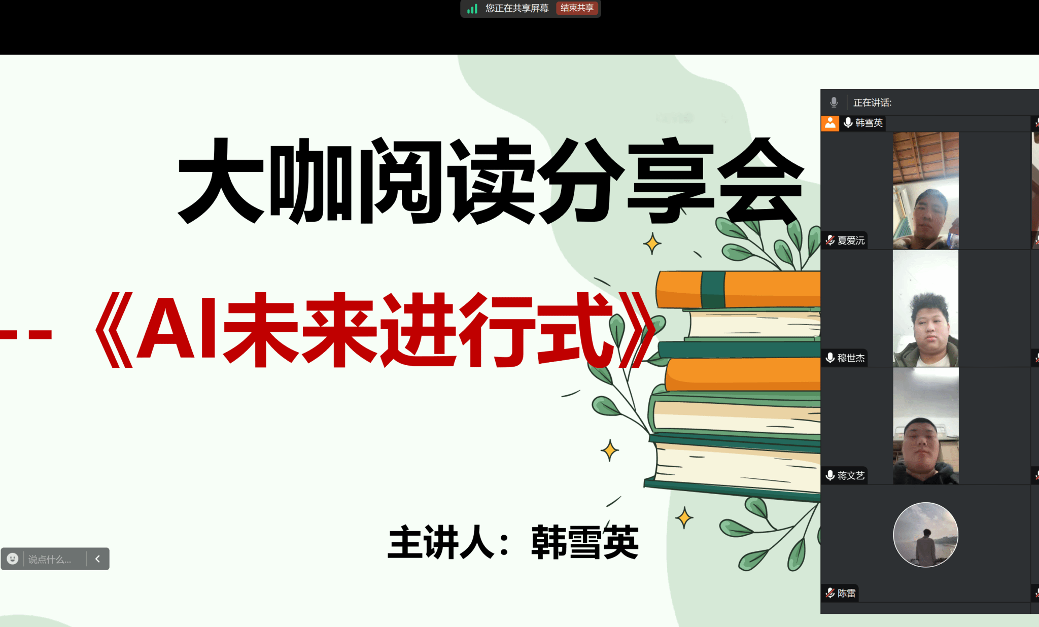 在活动中,韩老师领读一些精彩章节,并分享自己对该本书的感悟和理解,里面的故事引人入胜,涵盖了身临其境的沉浸式娱乐、自如使用人类语言的虚拟伴侣、完全自动驾驶汽车、能够以假乱真的照片和视频等未来场景,帮助我们理解从当下到未来AI技术可能对人类生活产生的变化;接着邀请了两位同学,分享他们感受较深的一些精彩的章节;活动中,韩老师说《AI未来进行式》是一本关于AI技术、应用、挑战与未来的全面探讨之作。通过阅读这本书,我们可以更加深入地了解AI的发展现状和未来趋势,为迎接AI时代的到来做好准备。