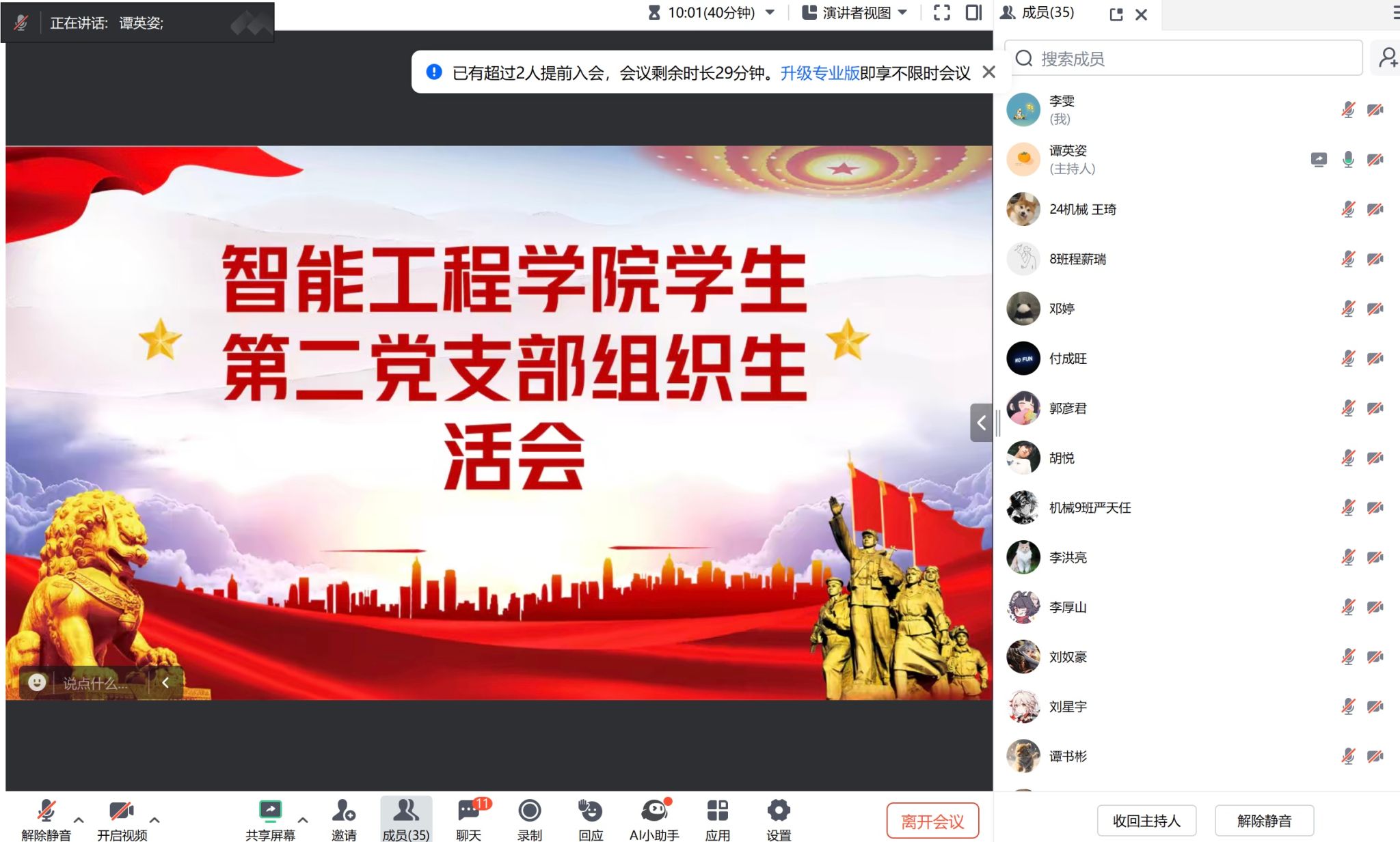 3月21日19时,智能工程学院学生第二党支部以腾讯会议形式召开专题党组织生活会,会议由学生党支部书的记谭英姿同志主持。会议紧扣“学思想、强党性、重实践、建新功”总要求,围绕深刻领悟“两个确立”决定性意义,坚决做到“两个维护”,聚焦学懂弄通做实习近平新时代中国特色社会主义思想,引导党员以“国之大者”的担当检视初心使命,以“红脸出汗”的自觉锤炼党性修养。