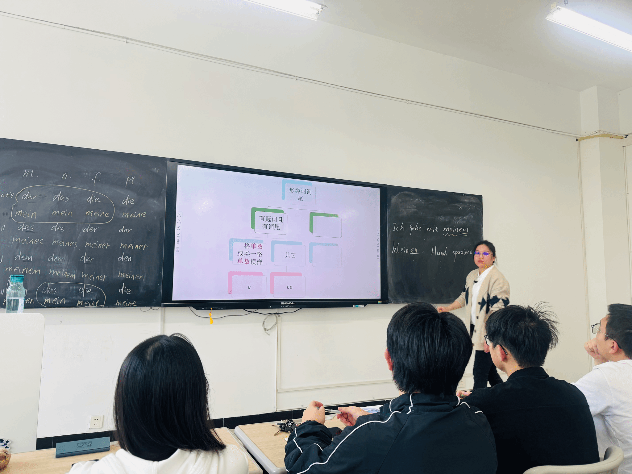 蹇红老师以中国四大传统节日为文化切入点,巧妙引出本次语法磨课主题——形容词变格。教师首先系统梳理了德语各类冠词的变格规则,并通过直观的“形容词词尾变化流程图”帮助学生建立完整的语法认知框架,并利用例子,佐证不同情况下形容词词尾的变化规律。