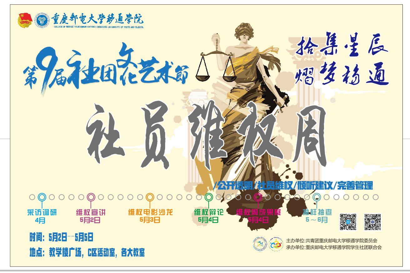 从5月2日至5月5日期间,我们会在教学楼广场设置意见投稿箱,广大社员可对任意社团进行投诉和登记,同时微博关注话题#第九届社团文化艺术节社员维权周#参与互动或者私信督导部官方微博,让你吐出心中的槽,对于“不公平”勇于说不,做自己的Superman!同时,还有“最受欢迎学生社团”投票活动,线上线下同时进行,结果由你决定!快来投票吧!(线下:教学楼广场维权点;线上:关注微信公众号“阿团拾梦”回复“最受欢迎学生社团”)
