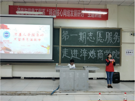 宣讲会首先由来自智能工程学院的青年雷锋王恩泽为大一学子分享了他的公益旅程。他的分享,让大家对志愿服务有了更广阔深刻的认识了解,也引起了各位小听众们对志愿服务的兴趣。其次,来自大数据与软件学院的宣讲人丁旭谈了自己的志愿心得,在助力问题少年成长的活动中,他提到自己亲身经历的感人事件,也令在座的学生们十分动容。视频“留住最美芳华”中的几对老年夫妻补拍结婚照的过程非常令人感动。老人在化妆拍照时,笑容洋溢在他们的脸上,从岁月的皱纹中漫出来,温馨了拍摄的楼道,也温馨了整个宣讲教室。最后由优秀志愿者陈思洁为大家分享了她的志愿服务旅程。从对志愿者的“初遇”,到“坚守”,再到“创造”;从一线的投身转到幕后的宣传和工作安排,她一直在坚持参与志愿服务,用自己的一颗真心去温暖需要帮助的人。陈思洁学姐的热情也融化了宣讲教室的各位学生。