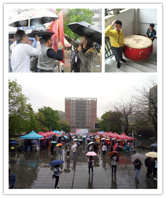 今天我作为完超的工作人员,负责用镜头记录下“完满超级团支部”成果展示活动的点点滴滴。天公不作美,期盼了那么久的晴天没有出现,老天爷是打定了主意要在我们的头上泼冷水。本以为今天的活动要败兴而归了。但就算如此,经过层层选拔脱颖而出的十六支团支部却依然在教学楼广场建起他们的大本营,冰冷的雨滴浇不灭他们的热血与激情,他们将这一学年的累累硕果展现在我们面前。