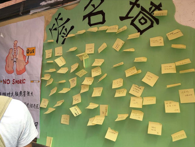 同学们积极参加此次活动,本次活动地点在第四片区两栋宿舍楼之间,片区学生干部也组织人员现场劝导吸烟的同学,停止吸烟,并现场将讲解吸烟危害并发放宣传资料,同学们踊跃得在“燃烧的是香烟,消耗的是生命”的签名墙上签字,以表决心,有的同学还将自己对禁烟的态度和看法通过便利贴展示出来,对大家进行倡议。