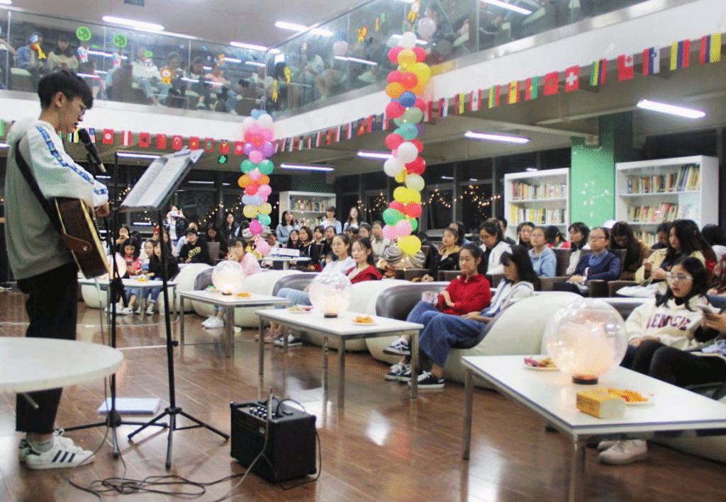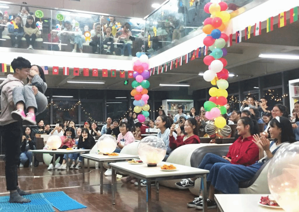 经过激烈紧张的游戏环节后,熊佳豪学长为同学们带来的一首《five hundred miles》醉乡民谣,也迎来了本次生日会最感动的惊喜环节。暖心的生日会祝福视频,一张张温柔的笑脸,一声声温馨的祝福在大屏幕上逐一呈现,传达着花果书院学生自治委员会对同学的热切关怀,也让“家”的温暖萦绕在同学们之间。视频播放的尾声,闪着荧荧烛光的生日蛋糕伴着生日快乐的歌声被花果书院的工作人员端到台前。22位寿星小仙女,已然被眼前的一幕幕暖心画面感动得热泪盈眶,她们紧闭双眼,一起在烛光前许下生日愿望,在自发而起的热烈掌声中,祝福悄然收入她们的心中。