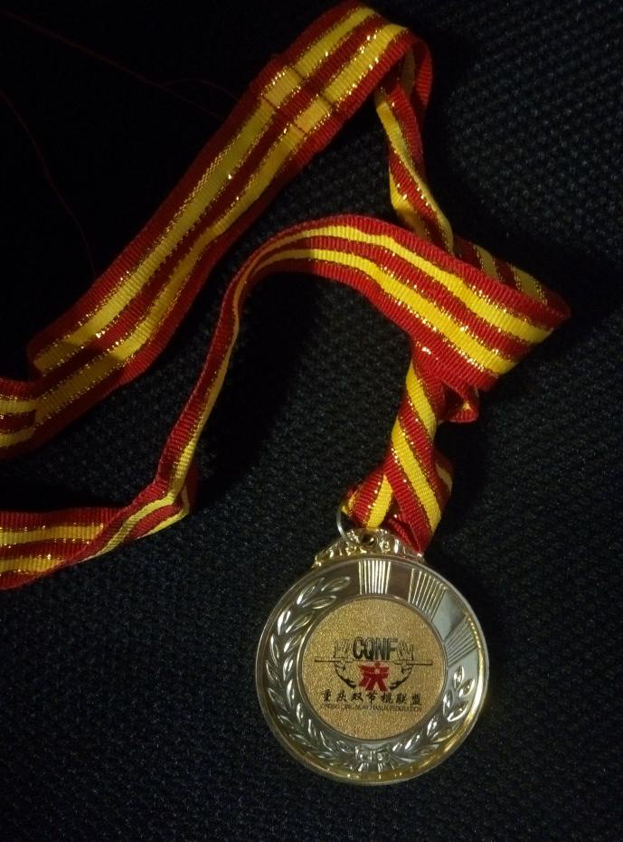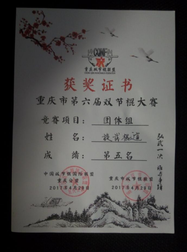 我校武道协会在重庆市第六届双节棍大赛团体赛旋武棍道中力战群雄,荣获第五名佳绩!社员张玉梅同学拔得头筹,荣获个人赛冠军!