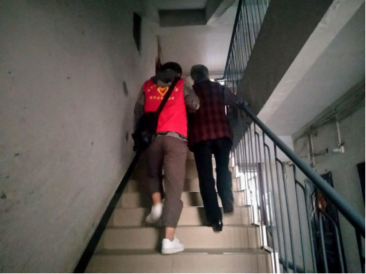 辗转多少个路口,跟随着志愿者影子的是这阴雨不眠的天气,当苏奶奶的双腿因为湿冷的天气,膝盖发麻。潮湿黑暗的楼道,也阻挡着奶奶回家的路。志愿者谭博文同学,用自己的双手,支撑了奶奶回家的路。