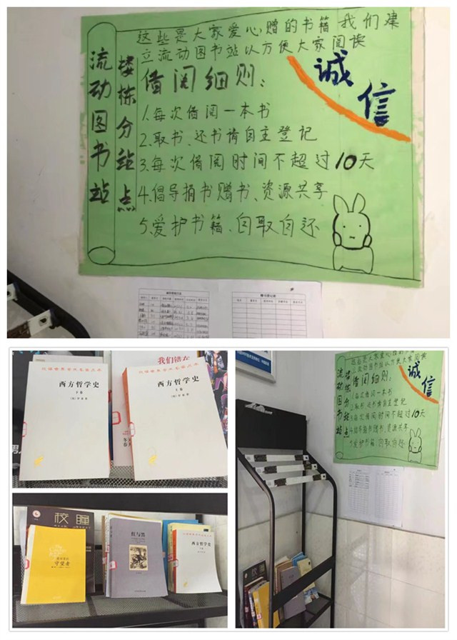 流动图书站实际上就是一个小型的“书籍中转站”,总体趋于公益性质,书籍均来自于学生,用之于学生。通过举办捐书、赠书活动,将同学们的闲置书籍集中起来进行循环利用,同时,在这个平台上,同学们平时也可将闲置的书籍“拿”出来,进行资源共享和知识互换,以进一步拓展宿舍楼栋文化与交流空间,丰富同学们的知识内容,从而更好地服务楼栋学生和营造学习氛围。