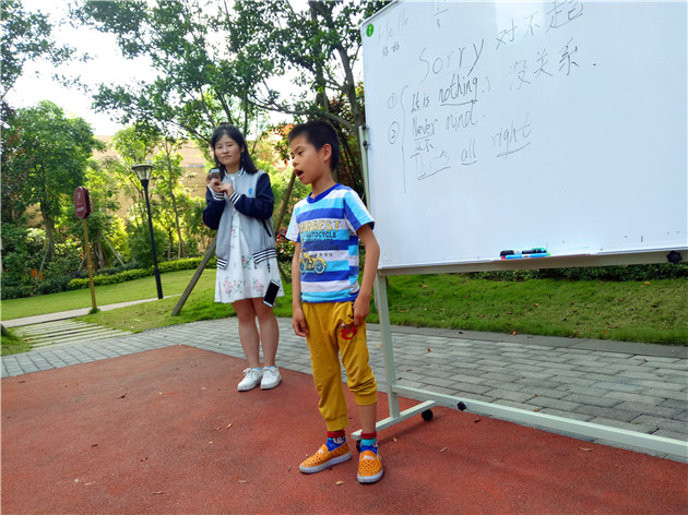 “Hello,good morning!”这样的声音此起彼伏,不知什么时候来了一群听课的大哥哥姐姐,原来他们是其他院系过来学习交流的,这样小朋友们学习得更卖力了。休息时的“击鼓传花”游戏,最后歌曲《同一个世界》,他们在一学期的学习中成长了不少。