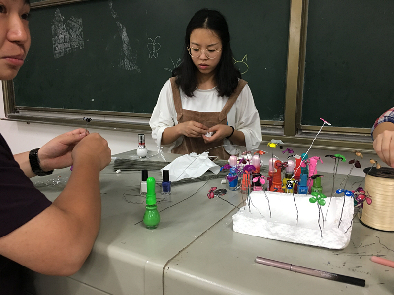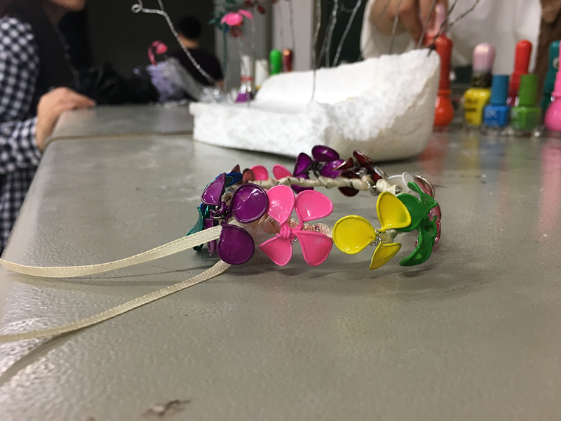 时间在点滴中流逝,掌握了技巧的同学们熟练的将手中的铁丝如意的扭动,将指甲油圈点在铁丝的方寸之地,看着他们认真的样子,不由得还觉得有点帅呢!在涂指甲油时,同学们难免会会不小心蹭到手上,这时,热心小伙伴跑来帮忙,帮他们控制住一端,然后继续进行,团结互助下,手工顺利完成,剩下的就是等它慢慢凝固,成型。制作前,我们都认为这是一场独立的制作,但过程中,我们逐渐发现,这是一场有序的团队合作,“你扶着、我上色”“我将其弯曲,你来定型”只有每一个参与者都通力合作,才能让其完美绽放。