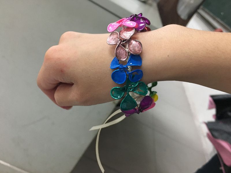 做手工需要的是细心和耐心,看似简单的教学实际操作起来也不是一件易事。涂指甲不仅考验的时涂的纹路,更是考验同学们的耐心程度,但我们的全体社员们都没有一丝放弃,他们勇往直前,热情洋溢的挥洒着满心热血,只为绽放那一朵朵美丽的指甲油花。伴随着窗外雨声的停止,社员们美美的花环手链也编织成功。小小的花环,承载着社员们希望与汗水,也带有我们对未来最美好的期望。