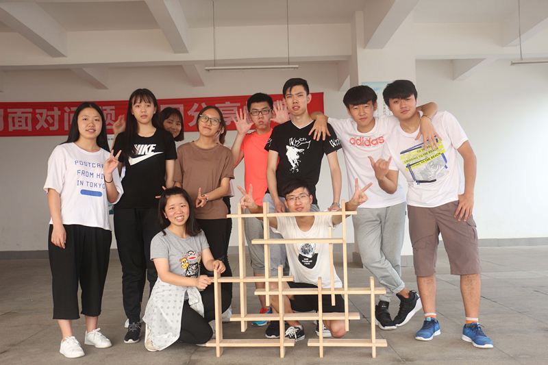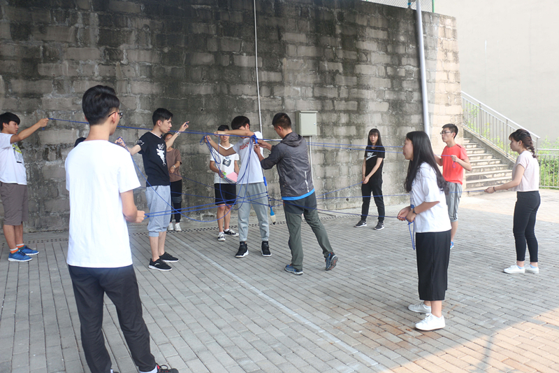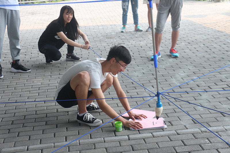 “社联一心,协力创新。”响亮而又整齐的口号从26位队员中爆发出来,队员们迅速整理好队伍,在教练的指挥下分为A、B两组,分开来体验三种不同的项目。教练首先选择了“呼吸机制作”的训练,活动分为看图区和制作区,各自了解后两对个派出一名队员进行沟通,制作区需要在无图纸的情况下完成“呼吸机”的制作,最终全组成员将用其吹爆气球,检验成败。在信息传递的过程中考验了团队的表达、沟通以及动手能力。一首五言绝句,八人握笔共同书写,“神笔马良”让参与的队员们感受到了团队合作的重要性。“对,这边不动,你那边使力”“往下面一点,不要过长,对对就是这样”在大家共同的合作中,这16根线仿佛融为一体,在一笔一划中,用心书写下那一个个美丽的字。小时候搭积木的游戏还历历在目,而今天的“搭书架”训练不仅让我们回忆了童年动手的趣味,也让我们体验到成长的意义。看似简单的动手,却耗费了队员们几乎仅剩的精力。放下,拾起,如此反反复复的拼接,只为找到那最合适、正确的接口。