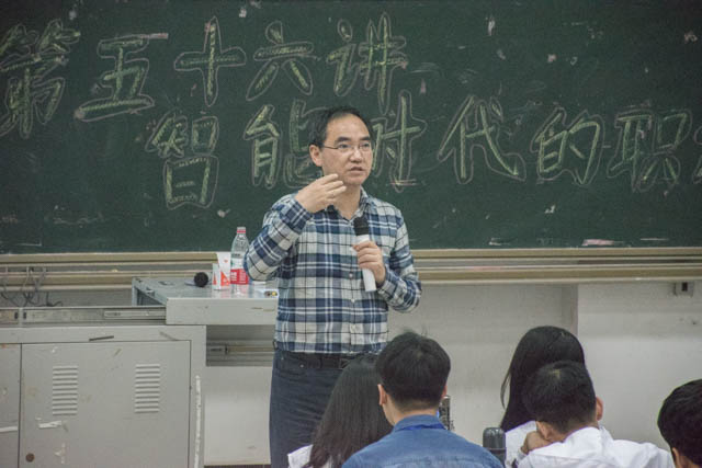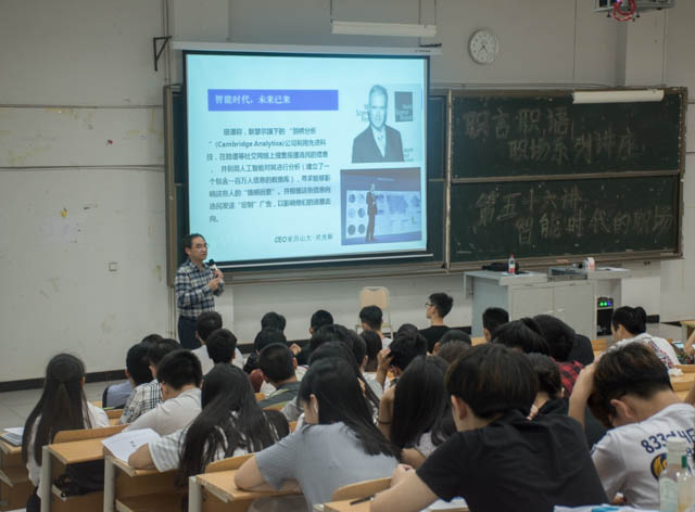 随着讲座的深入,谭老师也开始跟同学们互动起来,真正的职场并不全然看中先天条件,面对工作,同学们一心为着领导以最直接明了的处事风格,简单干练的技巧处理大小事宜,则无需害怕智能时代所带给同学们职场上的冲击。
