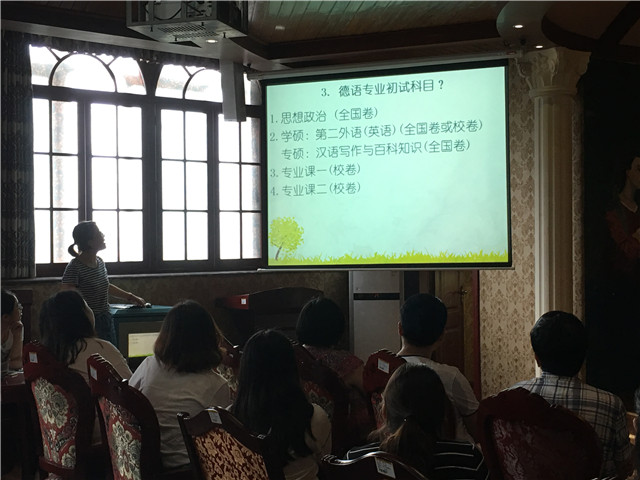 接着,德语专业齐菲菲老师以德语专业考研为例,详细地向大家讲解了考研的一些注意事项:首先需要留意考试时间,在规定时间里完成相应的工作;其次,老师提到硕士分为学术硕士和专业硕士两类,两者侧重研究点各有不同;之后老师为大家复习支了招,可以在报考学校的官网上下载近两年的真题进行复习,也可以在考研的官网上进行咨询,甚至可以在网上与志愿相同的“研友”交流;最后,老师强调,扎实的专业知识是必不可少的基础,同时也需要平常心的对待,只有两者兼备才能叩开研究之路。