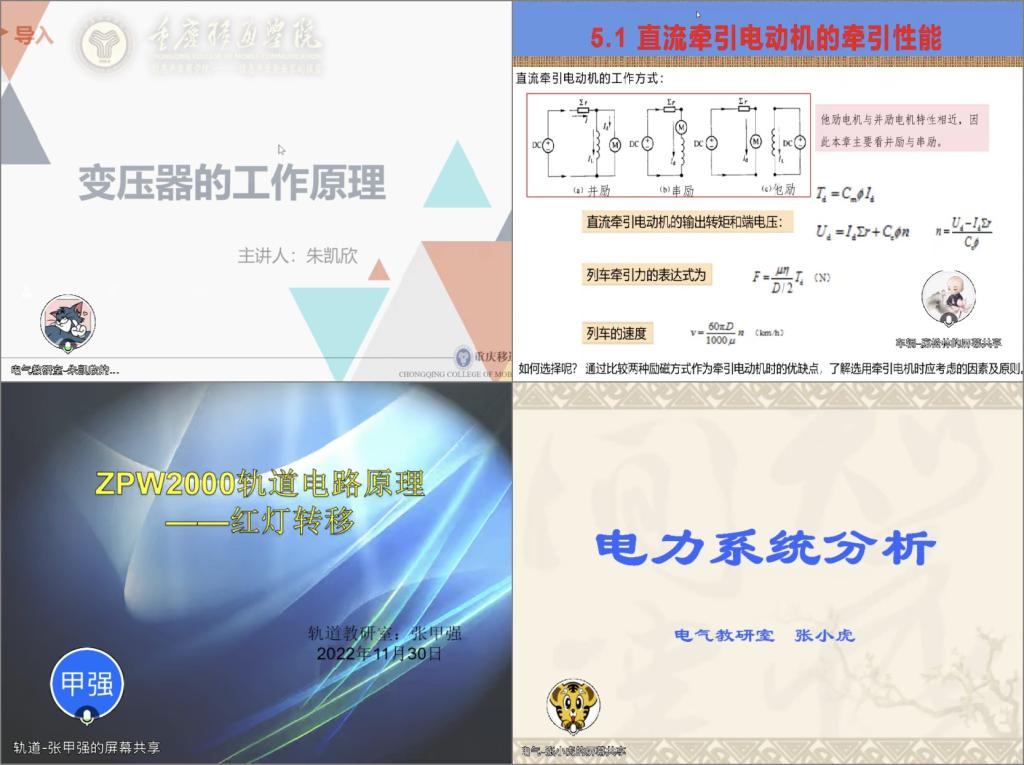 朱凯欣老师由工程实例引入本节课的主要内容《变压器的工作原理》,课程导入的电力电缆架设图片吸引眼球,随后讲解了变压器的原理,表达准确,通俗易懂。庞松林老师的《直流牵引系统》通过比较并励和串励两种励磁方式作为牵引电动机时的优缺点,使学生了解选用牵引电机时应考虑的因素及原则,内容讲解清晰易懂。张甲强老师《ZPW2000轨道电路原理》结合具体案例讲解红灯转移条件及电路原理,通俗易懂,通过布置课后思考题,让学生课上所学知识在课后得到巩固。《电力系统分析》课程的张小虎老师在讲授开始,抛出“电力系统为何用功率?”这个问题,激发了学生学习兴趣,随后引入功率与复功率的概念,结合动画讲解能量转换过程,引发学生思考,培养学生逻辑思维。