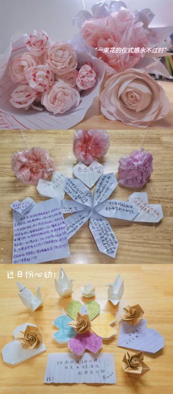 我们收到了很多来自天空书院同学们的感谢信,还有同学们亲手制作的百合花、玫瑰花、康乃馨,还有写满了感激文字叠成的千纸鹤,以及涂满了各种色彩的手工爱心s' l'h同学们的这些爱心小礼物真的打动了每一位老师,我真的感到无比地激动。同学们文字中写到:老师辛苦了,“最美的不是下雨天,而是与你一起躲过的屋檐”,感谢每一位在校园抗疫工作守护我们的志愿者老师。看到这些相信这一刻所有老师们心里都是暖暖的,所有的付出都是值得的!