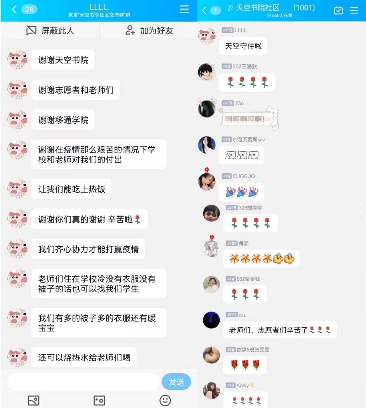 通过两个QQ群通知到每一位学生,“戴口罩、勤洗手,不窜寝、不聚集、天冷多加衣、做核酸保持一米间距、定时定点扔垃圾、不去公共洗衣房、非领饭做核酸时间不出寝”,感谢天空书院每一位同学对防疫工作的支持与理解,我们一同守护天空家!