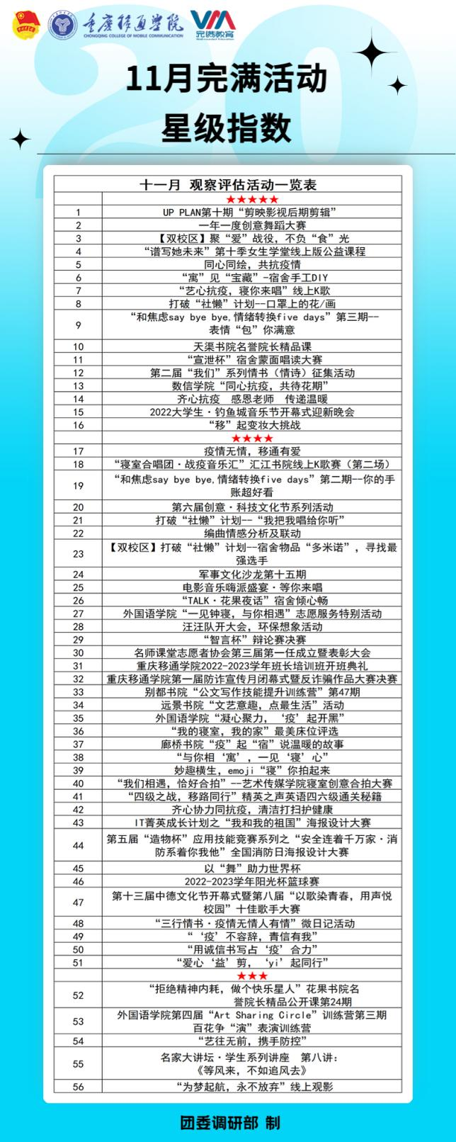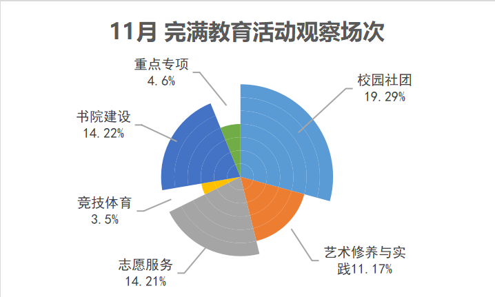 十一月是特殊的一个月,从11月8日起,移通按下暂停键,全校进入防疫封控时期,完满观察团即表示所有完满活动不得以延期开展或改为线上形式,但完满活动却从未暂停,顺势而为,应适而生,转变速度非常快,短短时间,据线上悠学派活动数据统计策划活动超200个,且活动非常有创新有意思,从活动数量、形式、内容上虽然比不上大活动的风采展示,但封寝不封爱,在做好自我防疫的同时,线上设计的完满活动,将宿舍生活玩出了新花样。值得注意的是,大多活动的参与人数多,但活动后期宣传不到位,前期准备较仓促,活动开展过程中流程和节奏的把控也有待加强。