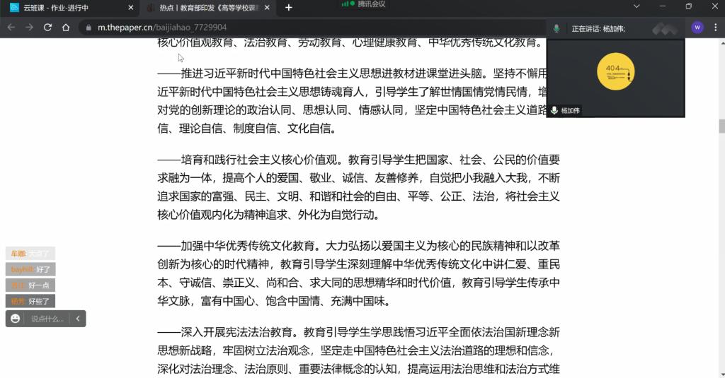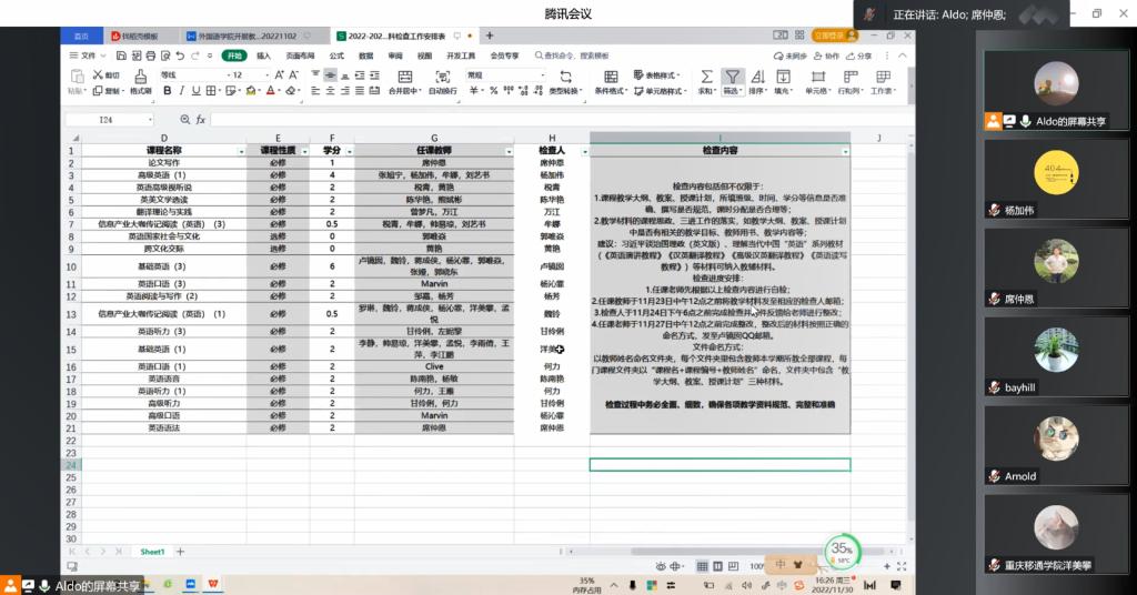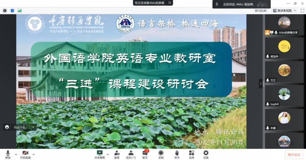 11月30日下午4点,外国语学院英语专业课程思政团队负责人齐聚云端,召开习近平新时代中国特色社会主义思想“进高校、进教材、进课堂”“三进”课程建设研讨会。本次会议是继外国语学院11月9日组织“支持院校特色实践的外语教学与科研资源”线上专题培训后的进一步工作推进,对于压实英语专业各课程“三进”工作任务具有重要意义。学院资深教授席仲恩、英语专业教研室主任卢镜囡、公共外语教研室主任张旭宁、英语专业各课程思政示范课负责人出席会议。