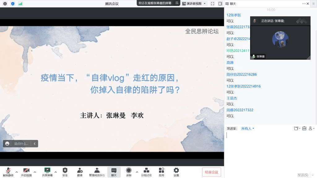 为更好地贯彻落实我校“四位一体+双院制”的教育理念,帮助同学们活跃思维,拓宽视野,在思考中奋进,在辨别中成长。11月23日16时马克思主义学院与鱼城书院联合举办了以“疫情时代背景下的自律问题”为主题的全民思辨论坛活动,此次活动由马克思主义学院张琳曼和李欢两位老师主讲。本次论坛活动两位老师分别从自律的好处、坏处以及疫情时代背景下自律vlog走红的原因三个方面进行分享,与参会同学们进行了互动,解答了同学们心中一些关于自律的困惑和疑虑。