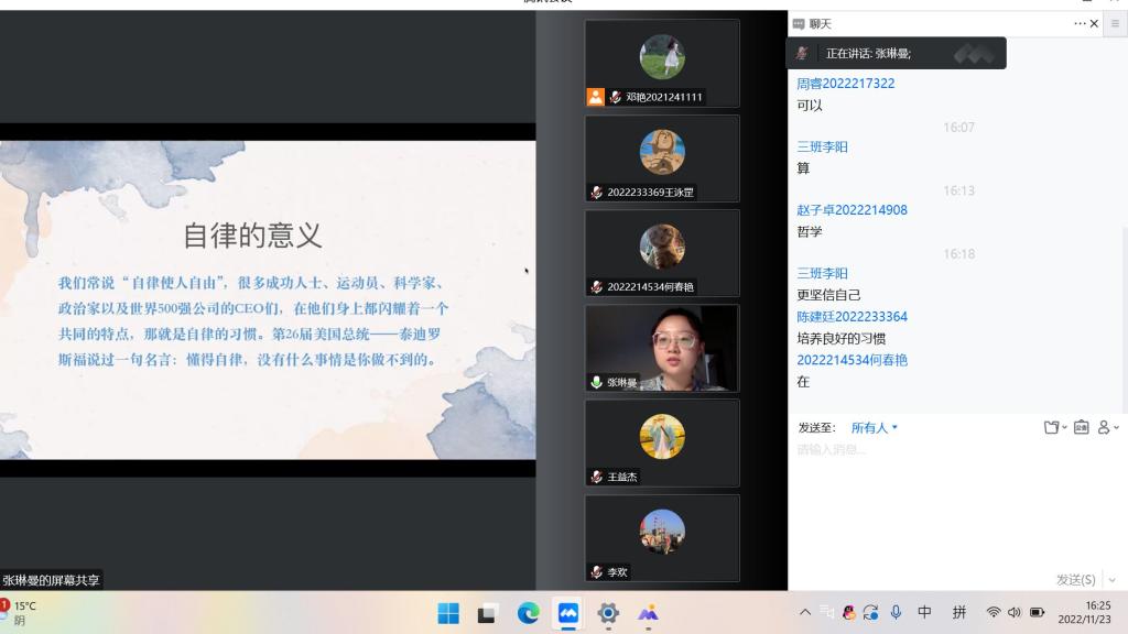 会议伊始,张琳曼老师从“自律的好处”这一视角入手,向同学们介绍了自律的概念以及自律与自由之间的关系,其引用了不少著名哲学家的观点,例如理性主义哲学家康德:自律即自由;启蒙思想家卢梭:人生而自由,却无往不在枷锁之中;存在主义哲学家萨特:人最大的不自由,就是我们永远也无法摆脱自由;哲学家斯宾诺莎:自由就是对必然性的认识……张老师通过概念的引入使同学们对自律的定义有了一定了解,进而引入关于自律的好处等问题的进一步探讨,让同学们受益匪浅。