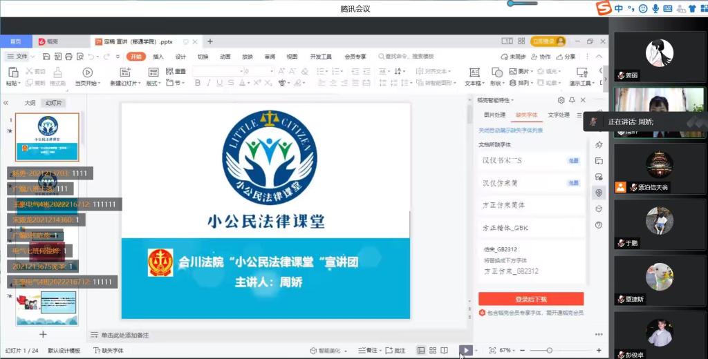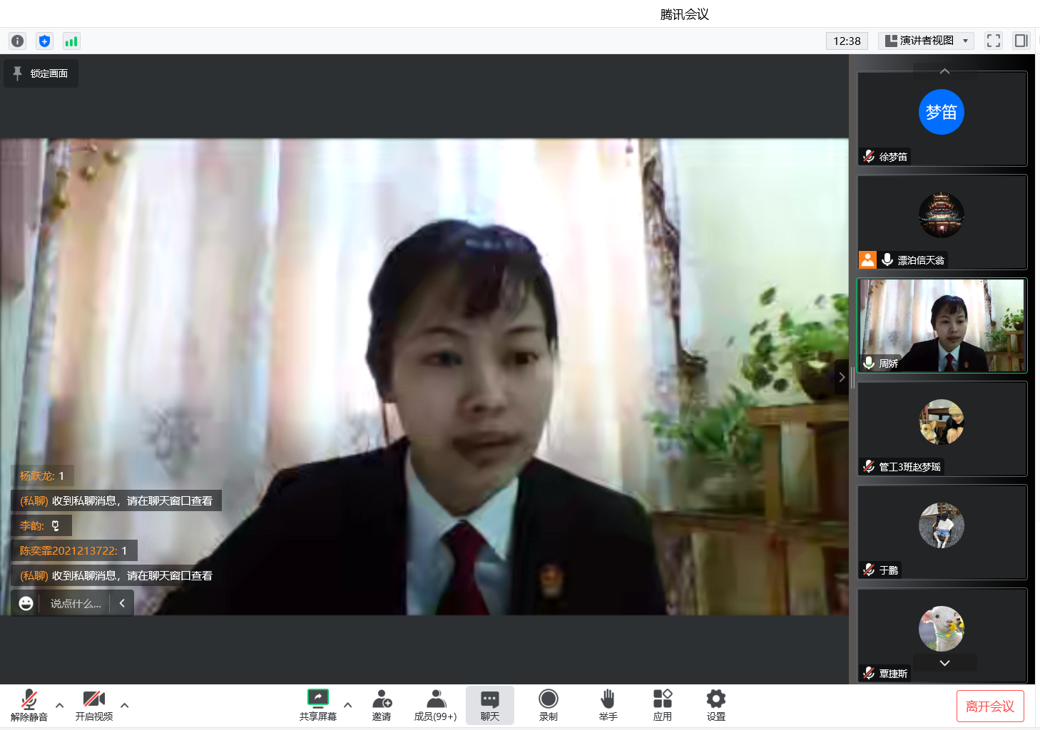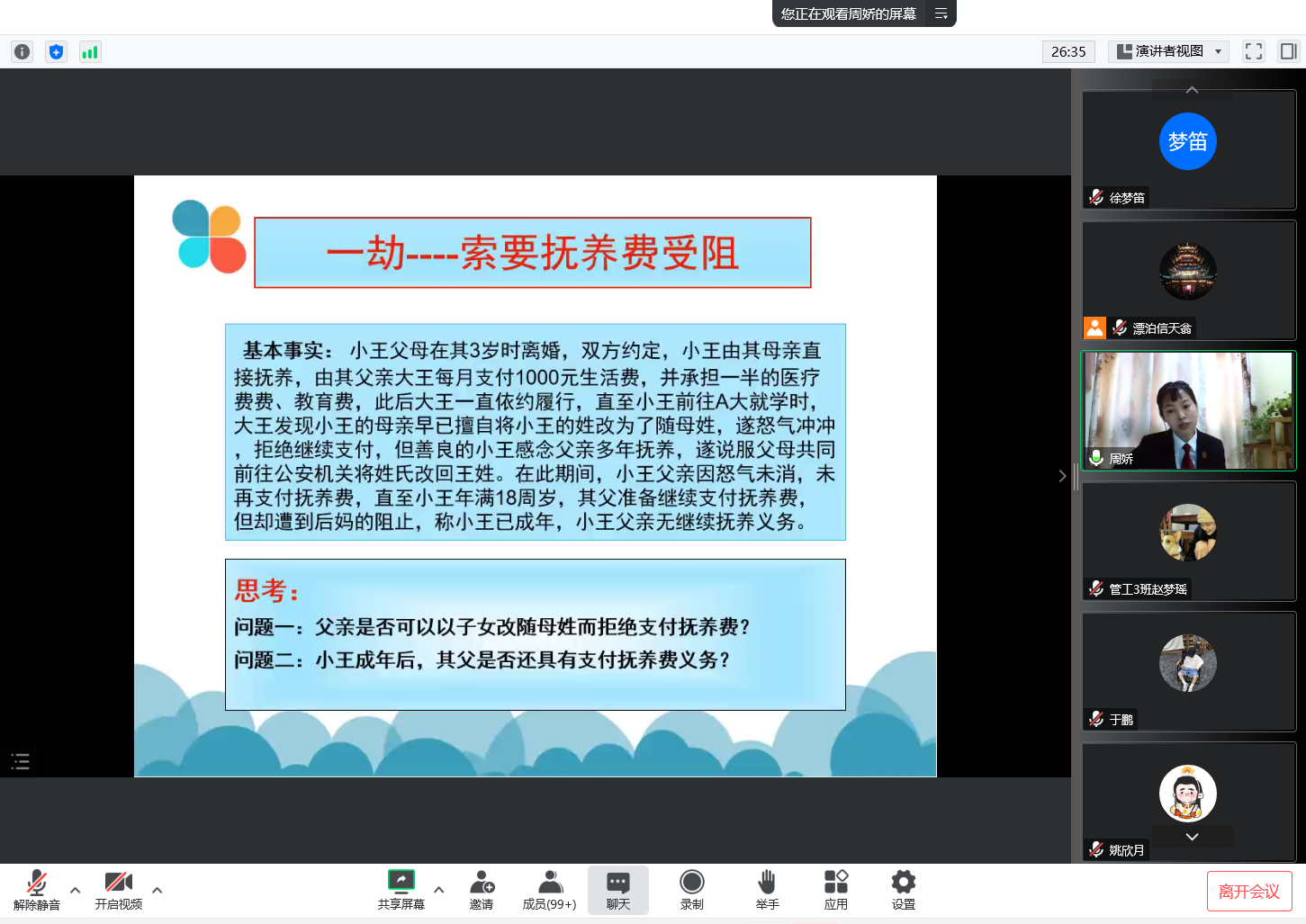 为加强我校法治教育,提升我校学生法治素养,培养同学们对法律知识的学习兴趣与热情,营造积极健康向上的校园文化,马克思主义学院思想道德与法治教研室于12月2日下午三点,采取腾讯会议的线上方式,邀请到了合川区人民法院周娇法官为同学们线上普法。本次活动由教研室主任杨勇主持,徐梦笛、姜丽老师带领2022级学生代表等共计130余人参加。