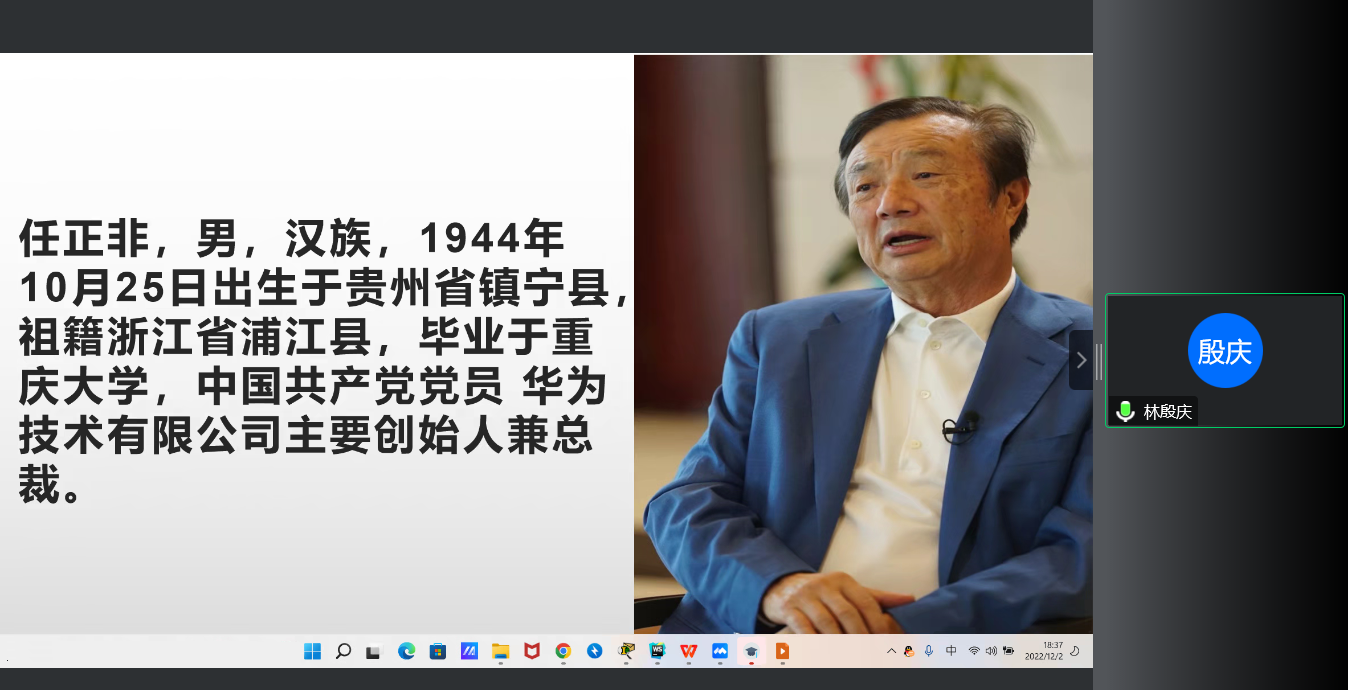 林殷庆同学主要分享了两个方面的内容:一是任正非的人生经历,二是华为的经营之道。任正非,1944年出生于贵州,读过大学,当过兵,而后创立华为,走上了经商之路。任正非在代理交换机中获得了第一桶金,然后决心自己研发交换机。当别人都在炒房挣钱的时候,他依然坚持自己的选择,想要让未来中国的技术能够领先世界。当我们遭遇地震灾难的时候,华为工程师率先出发冒着生命危险建基站,保证信号传输。林殷庆同学说,从任正非的身上,他感受到了责任与担当,任正非就是一个没有自我的人,是有着强烈民族和责任感的人。任正非身上的这种责任与担当也体现在华为的经营中,顾客、服务、质量永远是优先的,永远是这个公司的一种代名词。